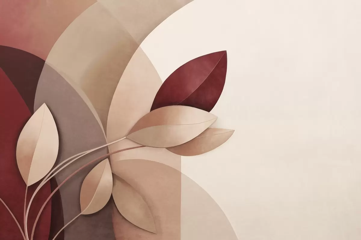 Fotomurales Rama abstracta con textura y hojas en tonos marrones, beige y rojos, sobre un fondo de formas abstractas. Nr. w09618