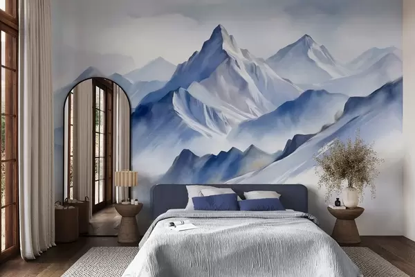 Fotomurales Montañas nevadas con textura, un suave efecto acuarela y una paleta de colores azul y blanco. Nr. w09630