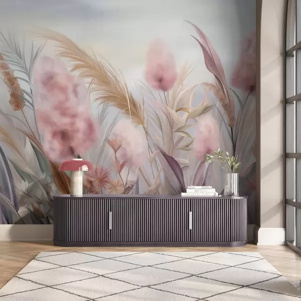 Fotomurales Hierba de la pampa rosa y beige y otras flores secas con un cielo suave y brumoso al fondo. Nr. w09635