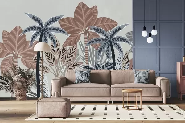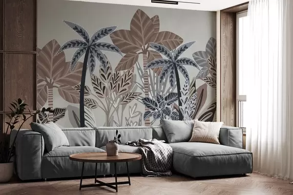 Fotomurales Plantas tropicales y palmeras con textura y colores apagados en estilo boho decorativo sobre un fondo gris. Nr. w09639v1