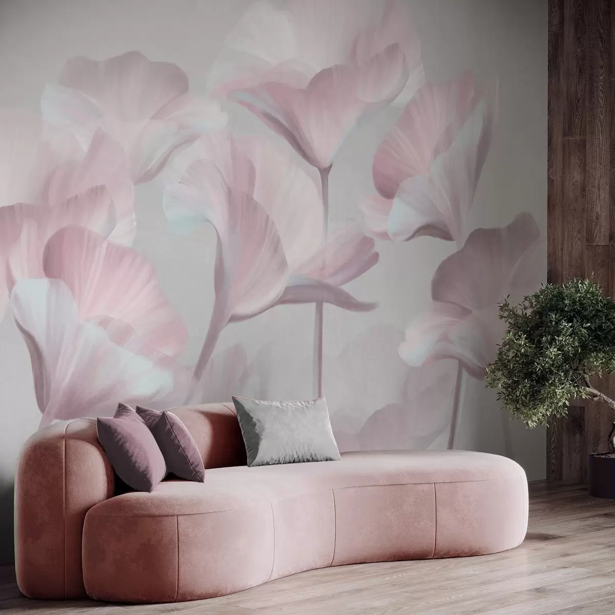 Fotomurales Flores de loto translúcidas de color rosa pálido con pétalos delicados sobre un fondo gris apagado. Nr. w09640v1