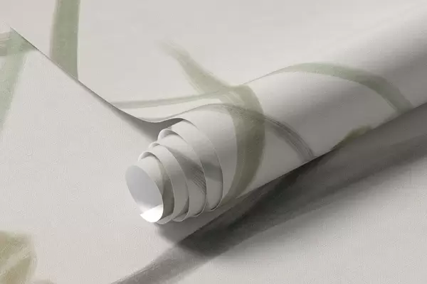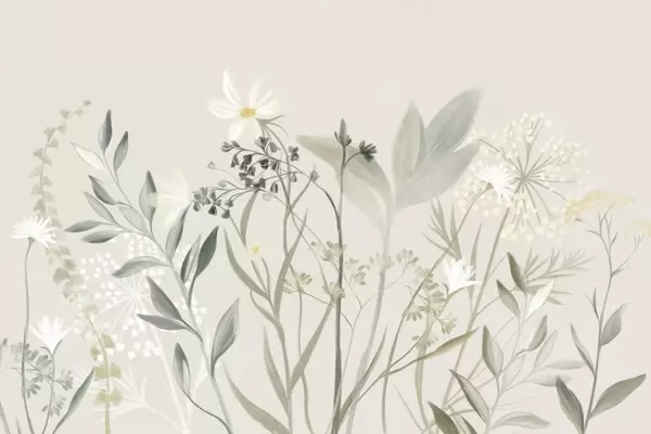 Fotomurales Delicadas flores silvestres y follaje con textura en tonos verdes y crema apagados sobre un fondo beige suave. Nr. w09641