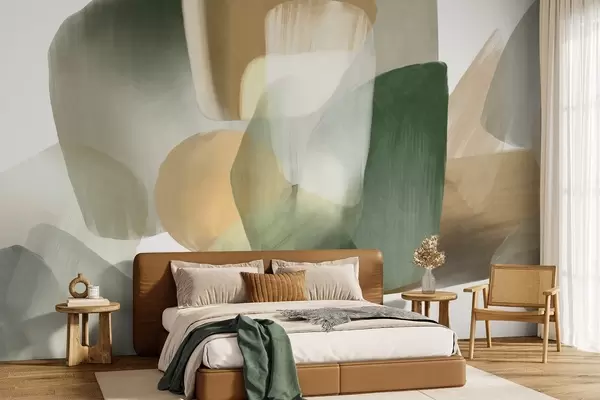 Fotomurales Formas abstractas con textura en colores verde y beige apagados, con bordes suaves y capas superpuestas. Nr. w09642