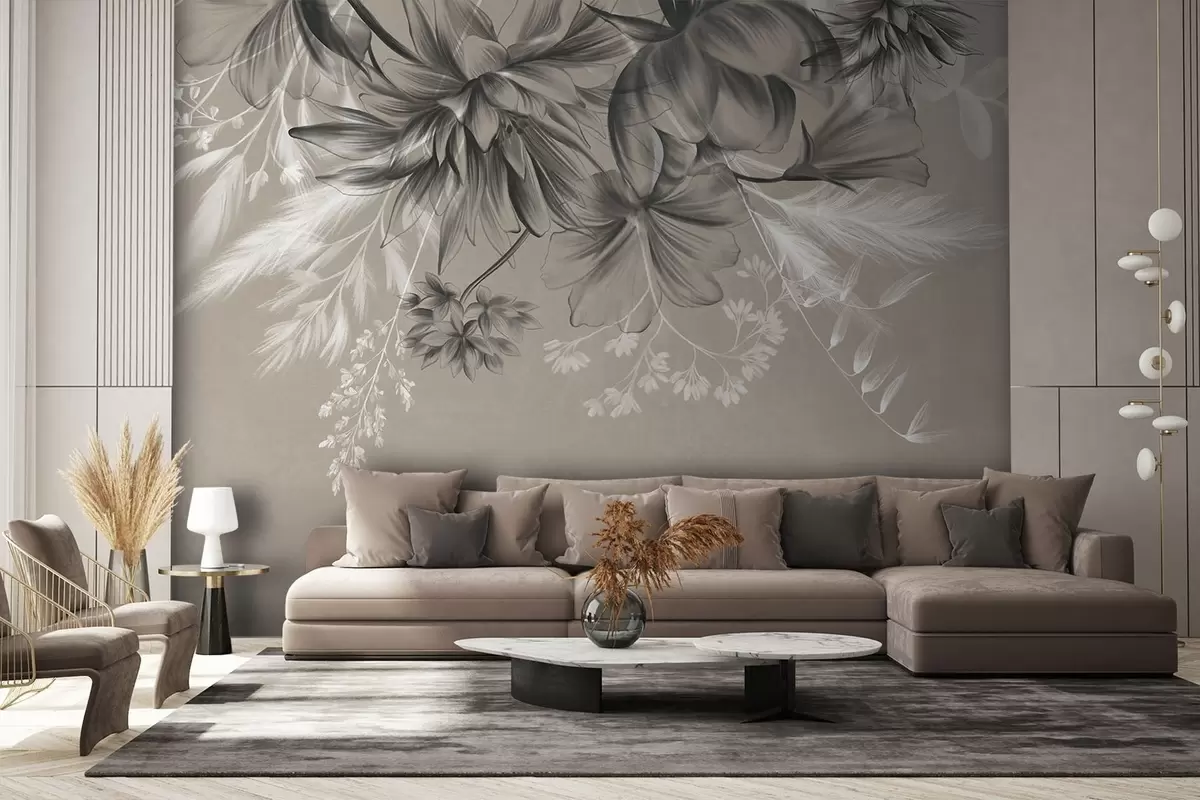 Fotomurales Flores y helechos texturizados en tonos gris oscuro y blanco sobre un fondo beige apagado, estilo de dibujo. Nr. w09644