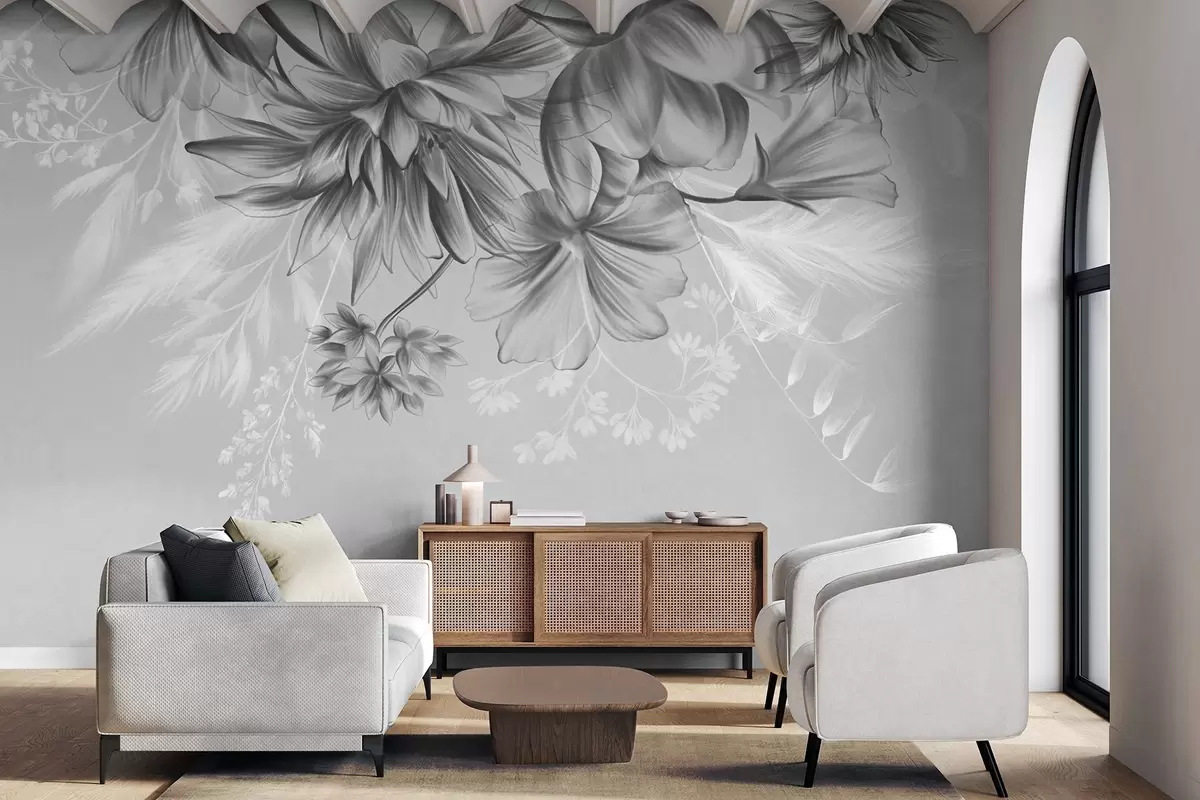 Fotomurales Flores y helechos texturizados en tonos gris oscuro y blanco sobre un fondo gris apagado, estilo de dibujo. Nr. w09644v1