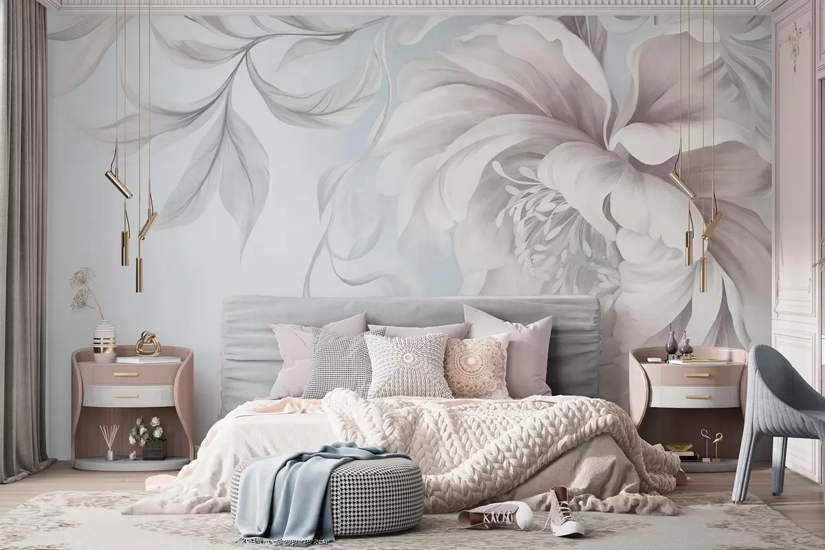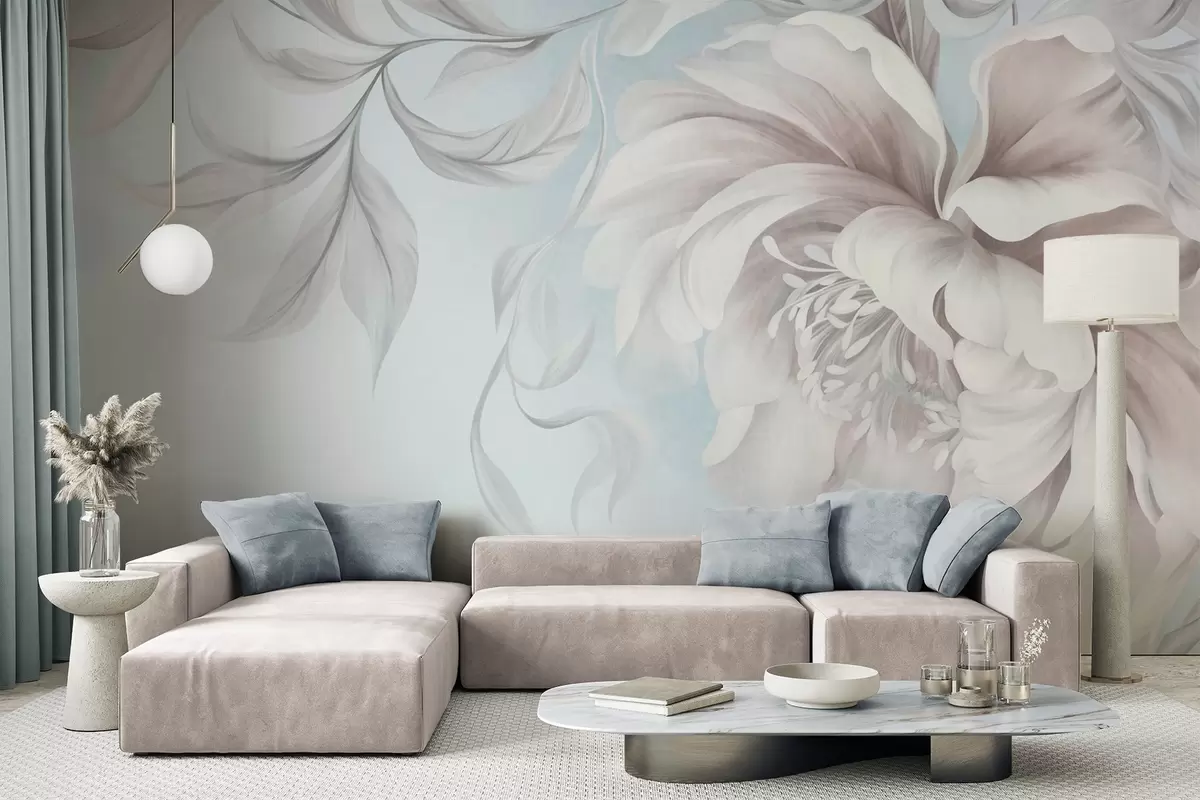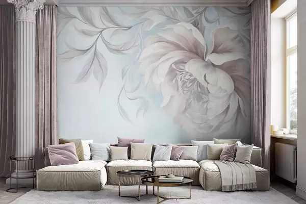 Fotomurales Peonía grande y con relieve, de pétalos delicados y hojas grises, pintada con un estilo suave Nr. w09647v1