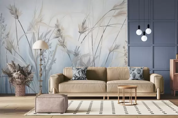Fotomurales Tallos altos y secos de hierba con puntas plumosas en tonos apagados, fondo azul y blanco suave y difuminado. Nr. w09652