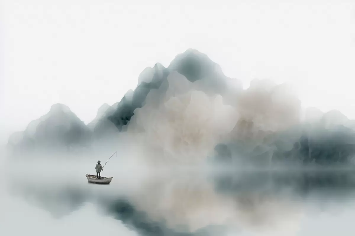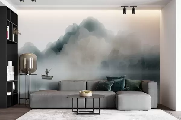 Fotomurales Paisaje montañoso con un barco y un pescador que se desvanecen en una suave niebla Nr. w09678