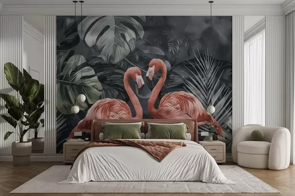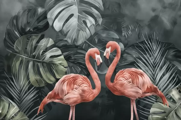 Fotomurales Una pareja de flamencos entre plantas tropicales. Nr. w09687
