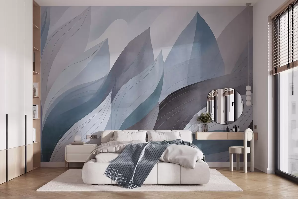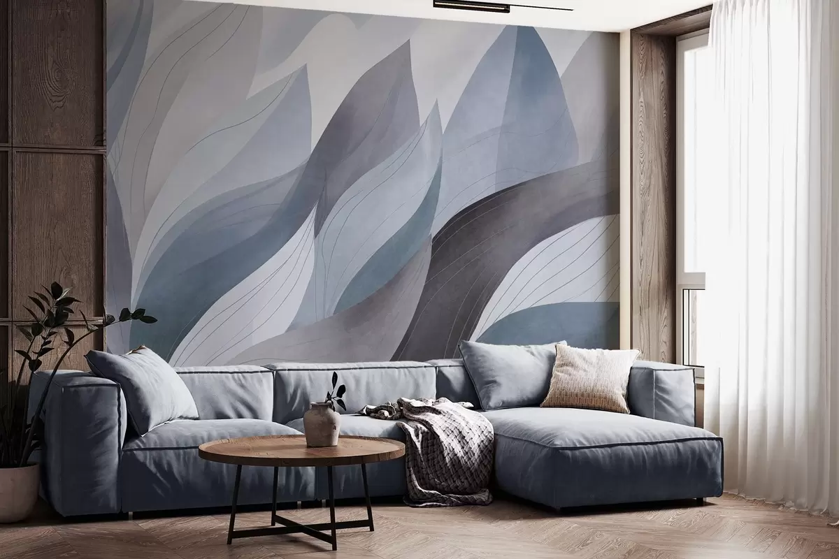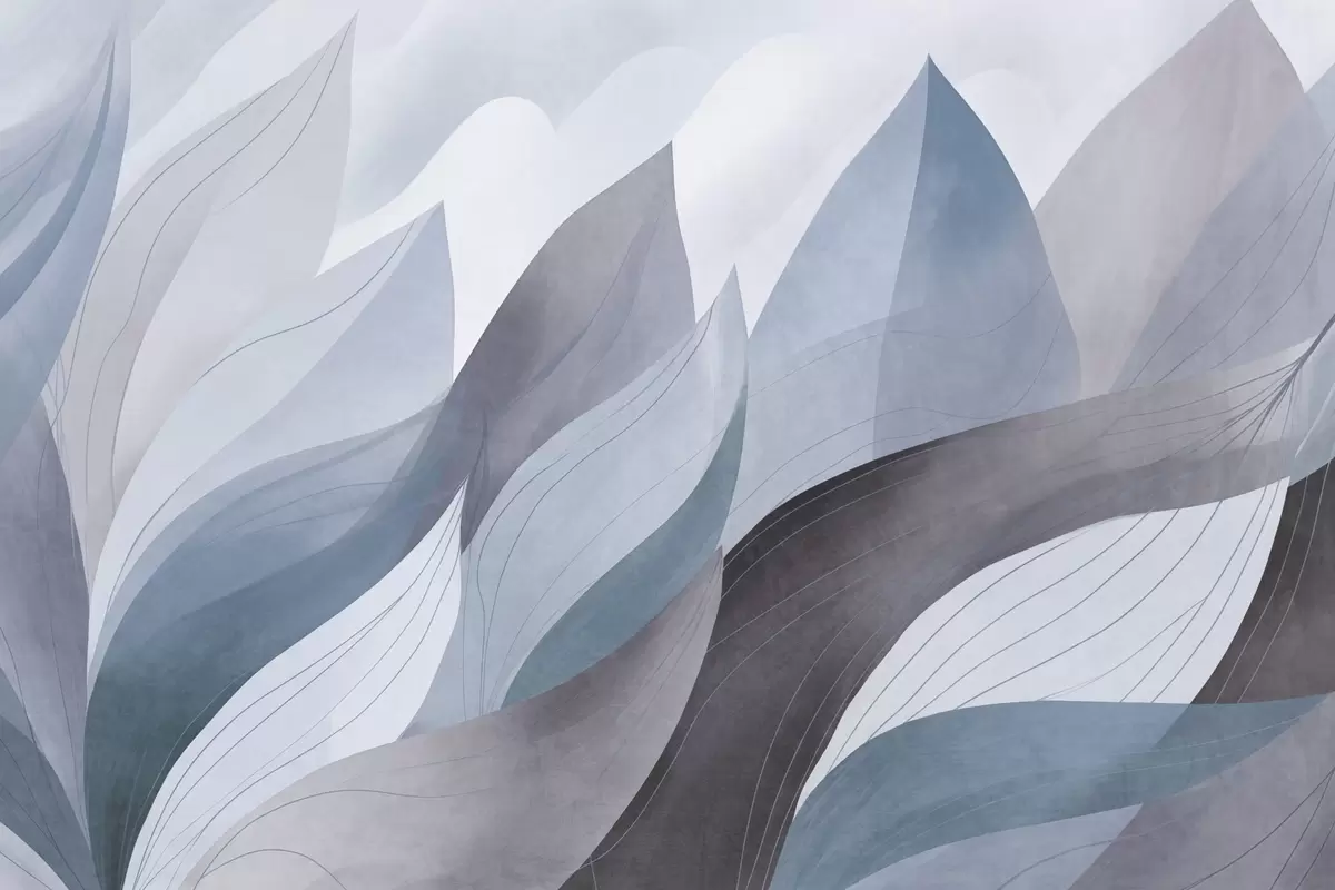 Fotomurales Hojas abstractas, tonos tierra apagados en azul con delicados detalles lineales, textura suave de acuarela. Nr. w09736v1