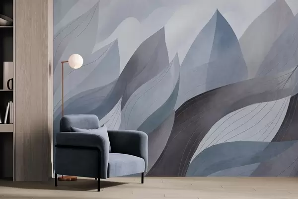 Fotomurales Hojas abstractas, tonos tierra apagados en azul con delicados detalles lineales, textura suave de acuarela. Nr. w09736v1