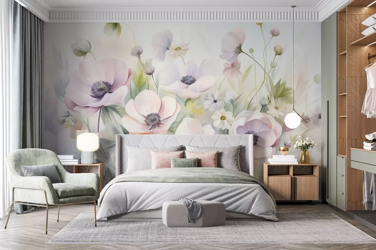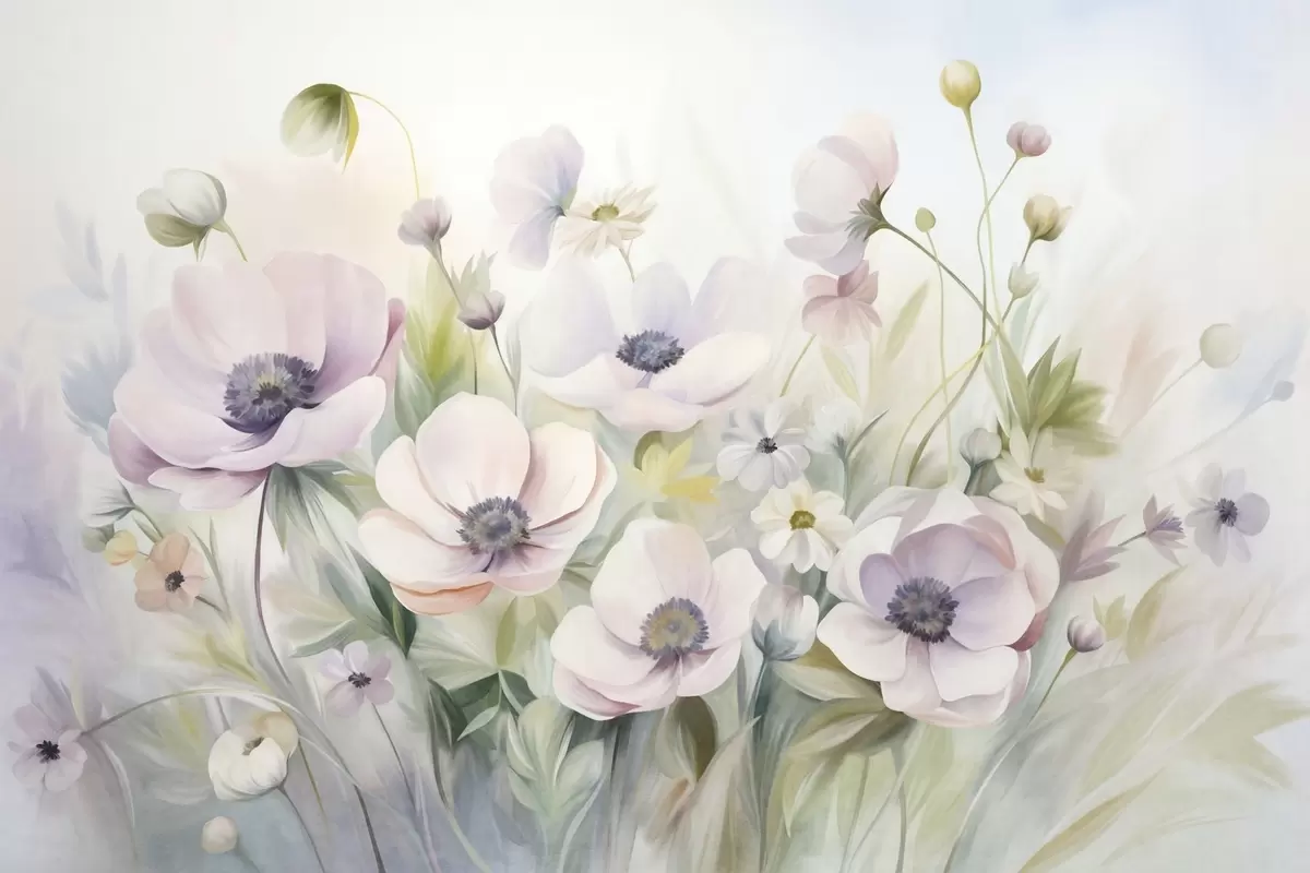 Fotomurales Un campo de flores de anémona en tonos rosa pastel y blanco, follaje verde y pequeñas margaritas blancas. Nr. w09742