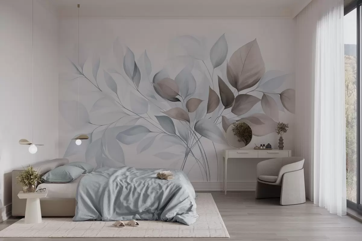 Fotomurales Hojas abstractas translúcidas en tonos azules, beige y marrones, arte texturizado. Nr. w09744v1