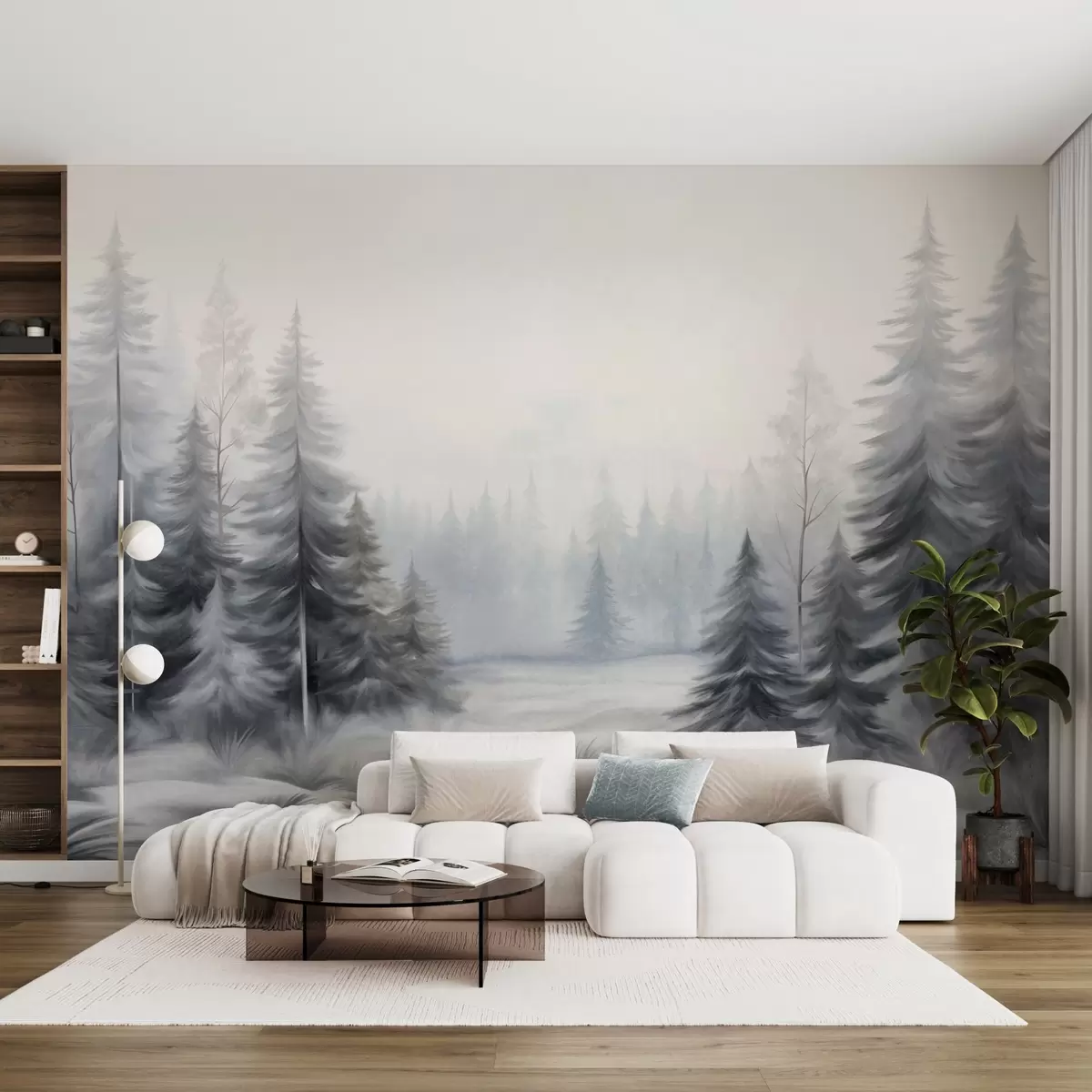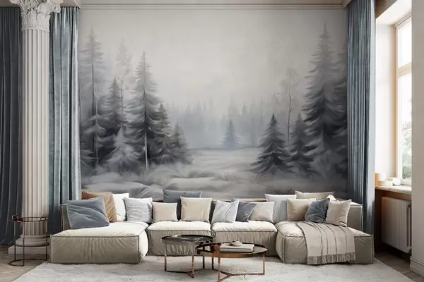 Fotomurales Árboles invernales con textura en un bosque envuelto en niebla, en tonos grises y blancos apagados. Nr. w09745