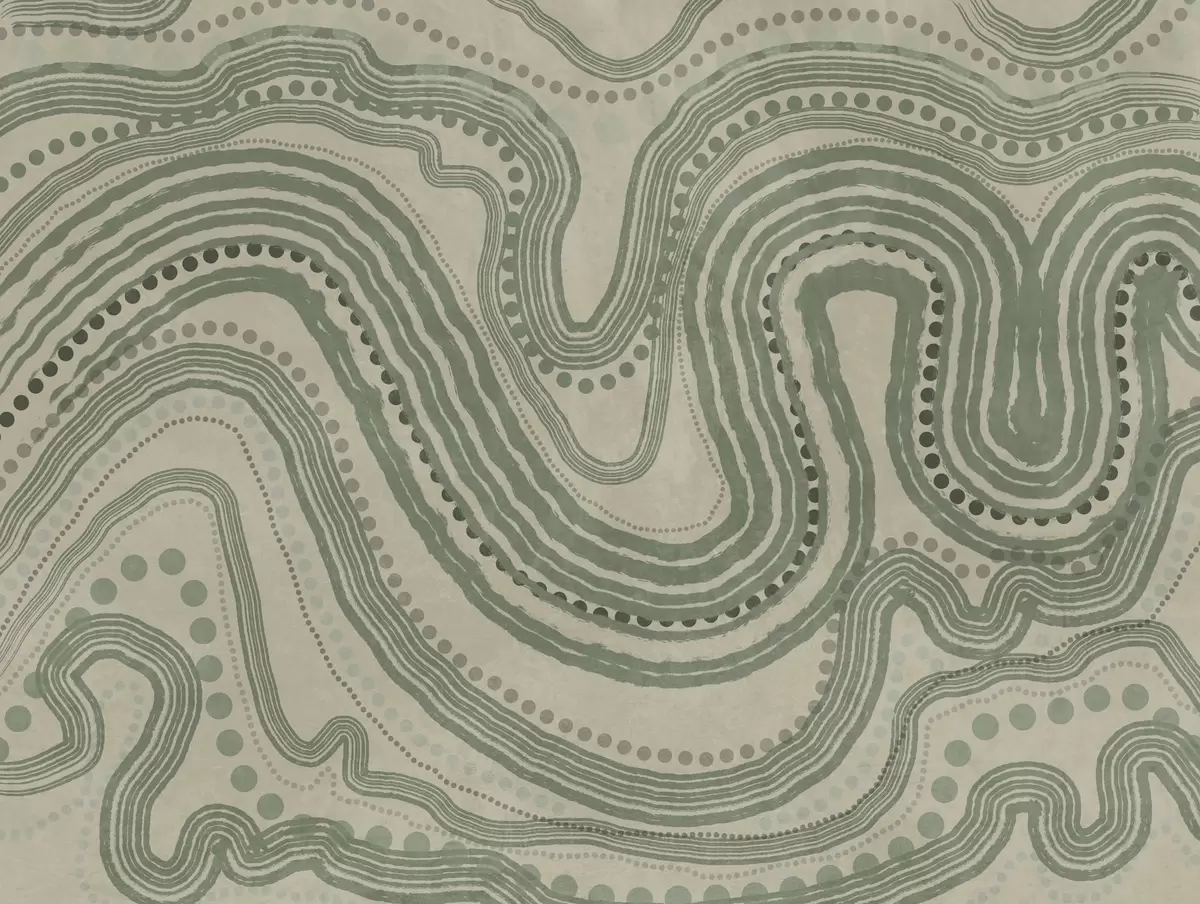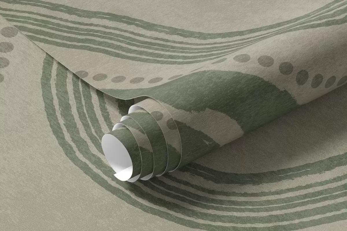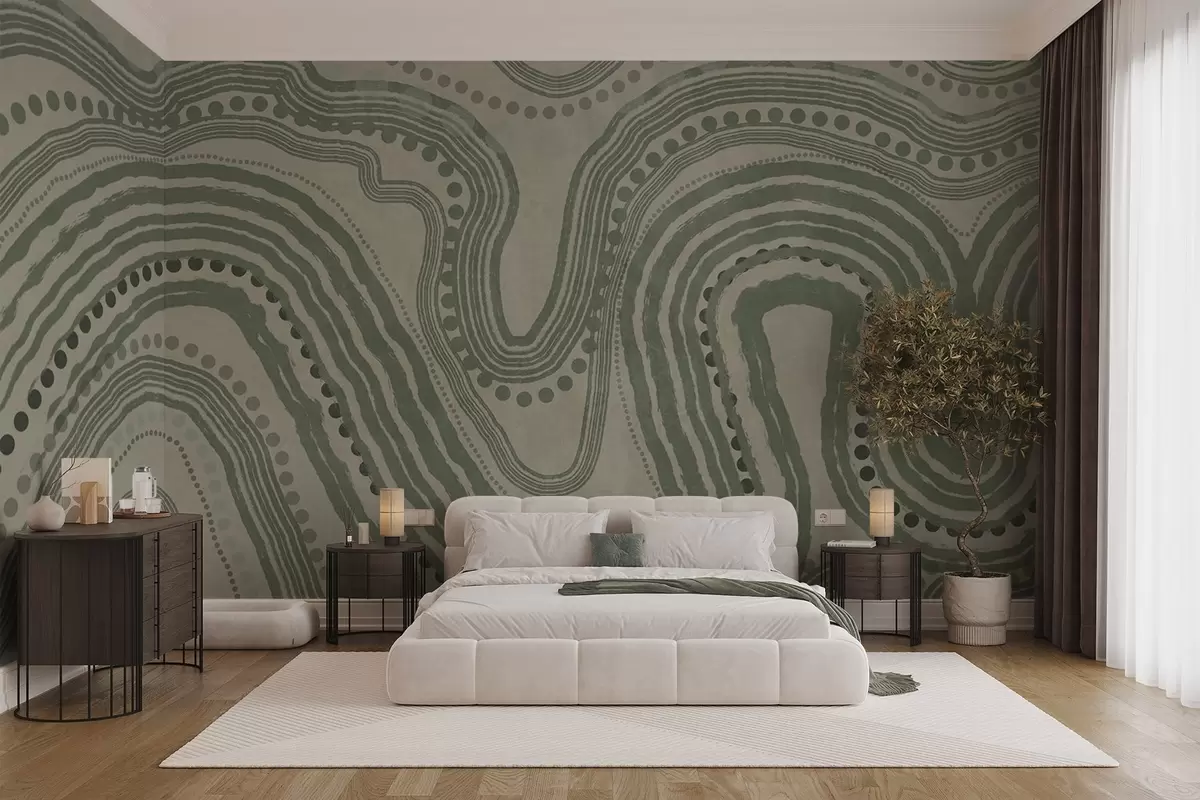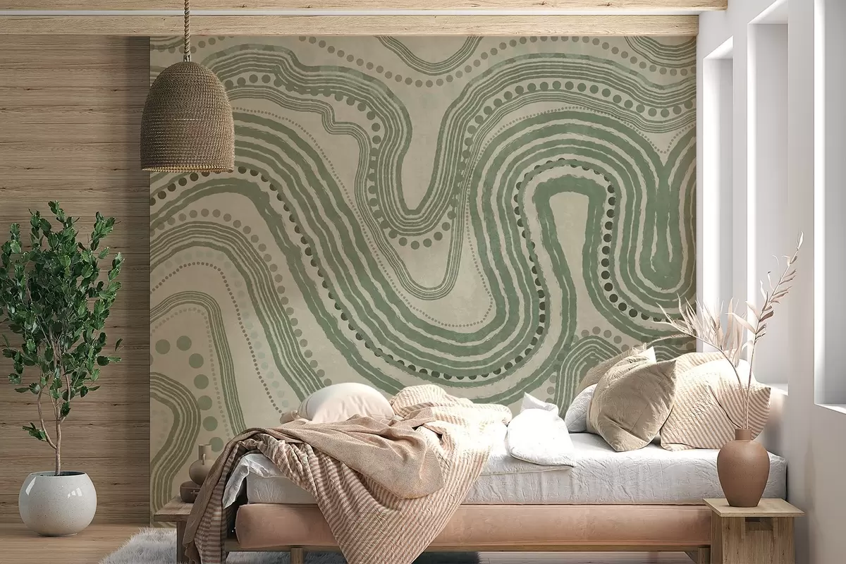 Fotomurales Líneas onduladas y puntos abstractos en verde y beige, arte moderno con textura. Nr. w09747