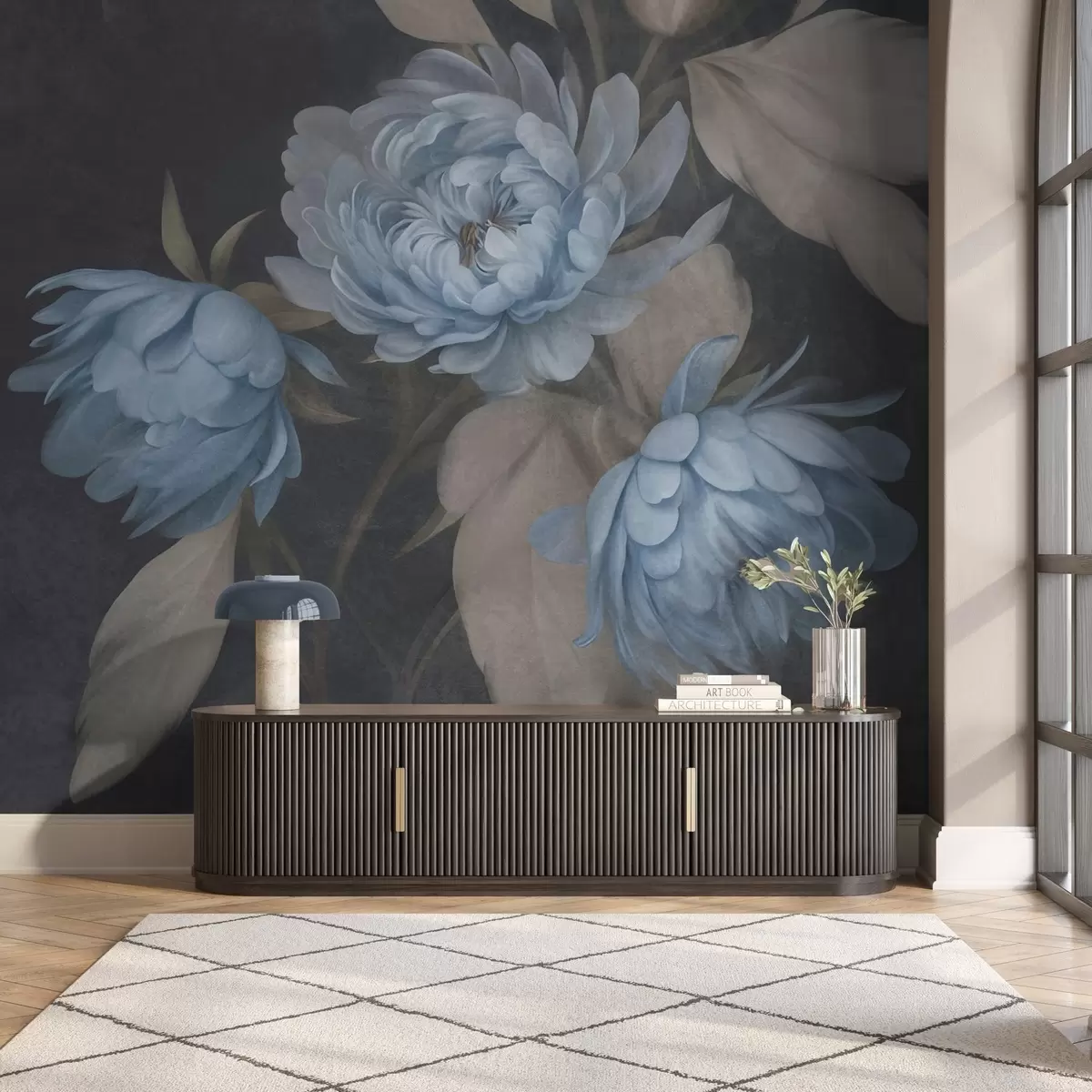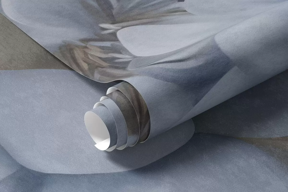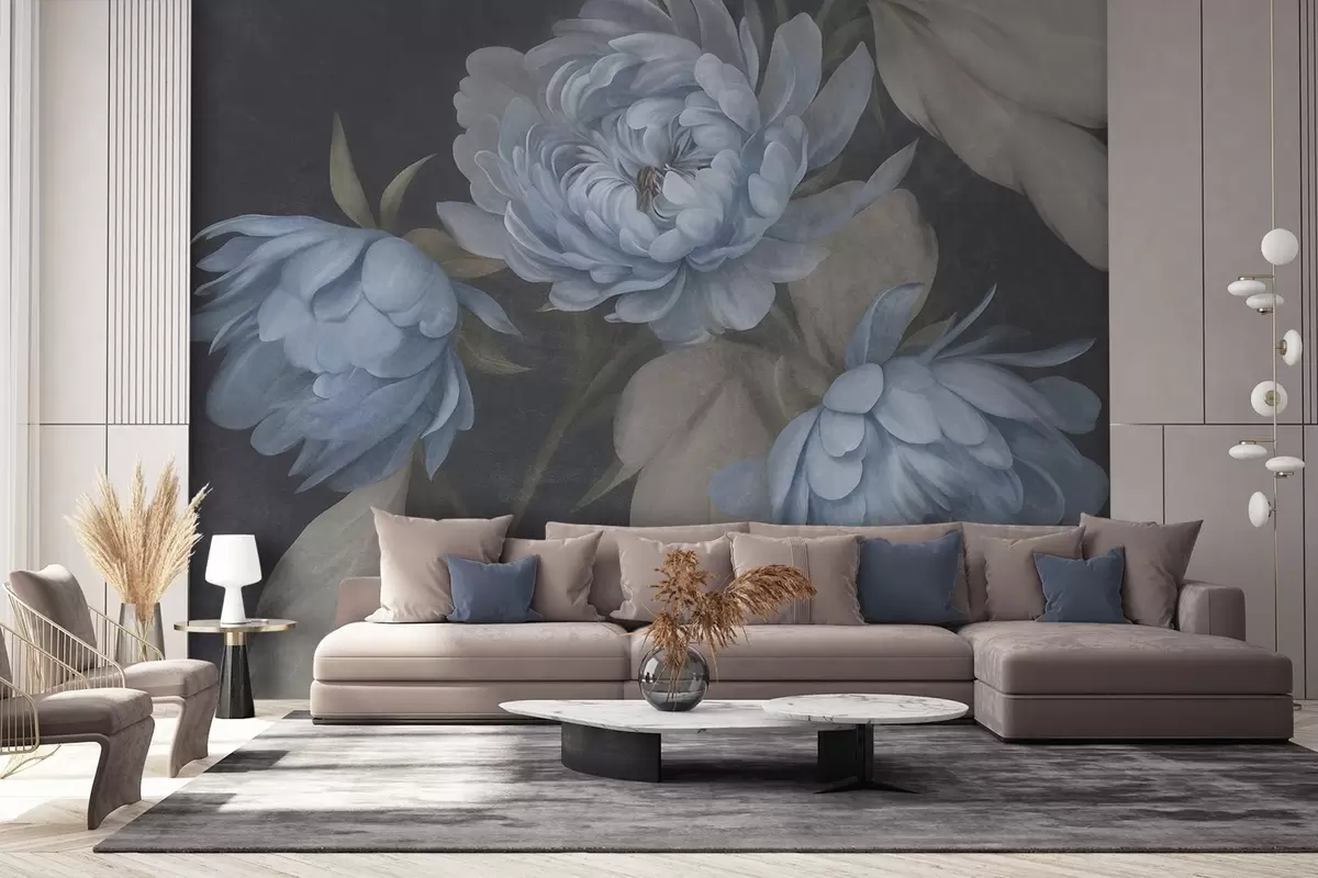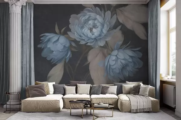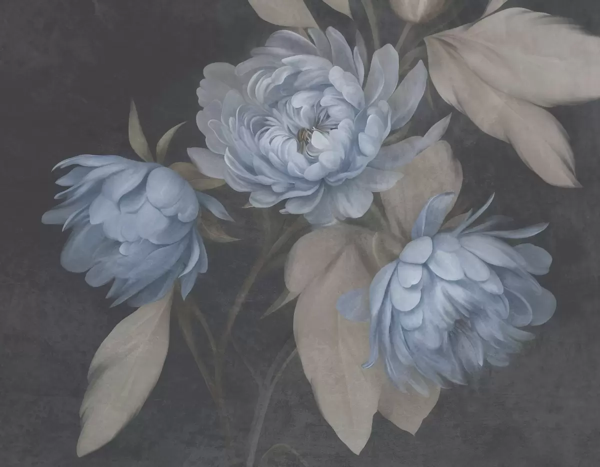 Fotomurales Flores de peonía azul claro con textura y hojas de color beige sobre un fondo oscuro Nr. w09751
