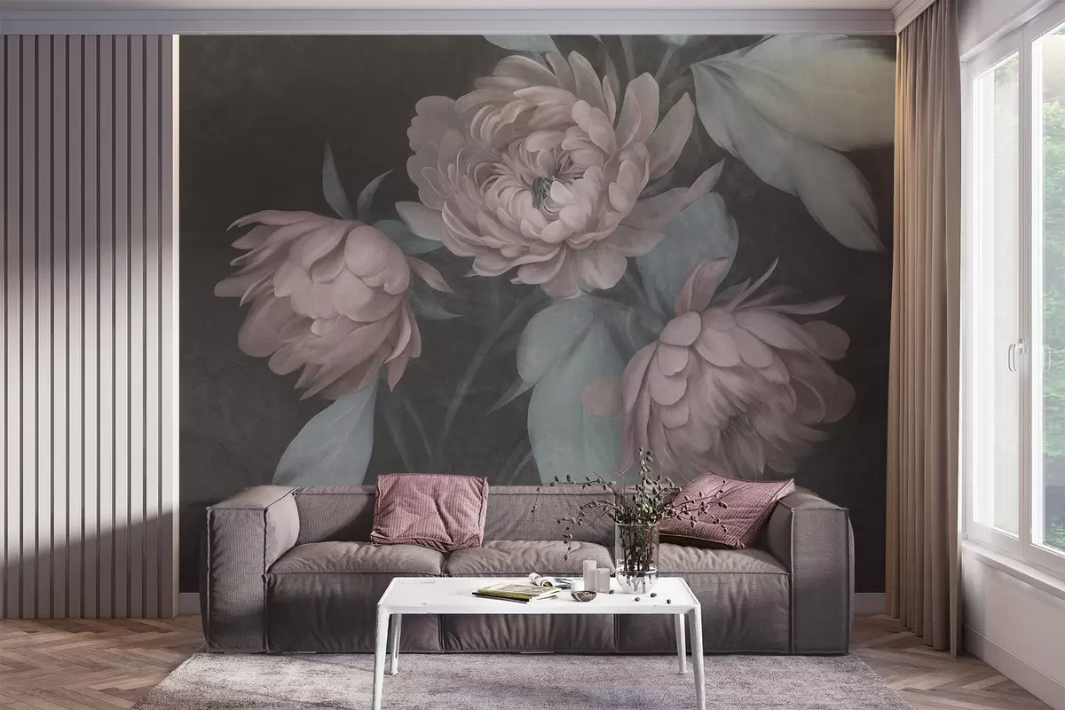 Fotomurales Flores de peonía de color rosa claro con textura y hojas de un verde apagado sobre un fondo oscuro Nr. w09751v1