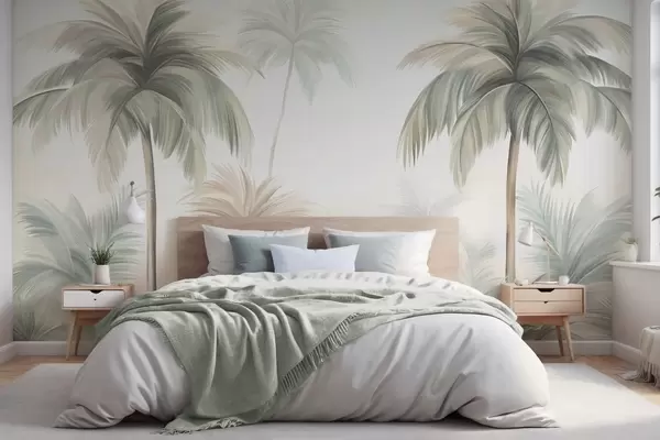 Fotomurales Palmeras con hojas de textura rugosa en tonos verdes apagados y beige, recortadas contra un cielo suave Nr. w09770