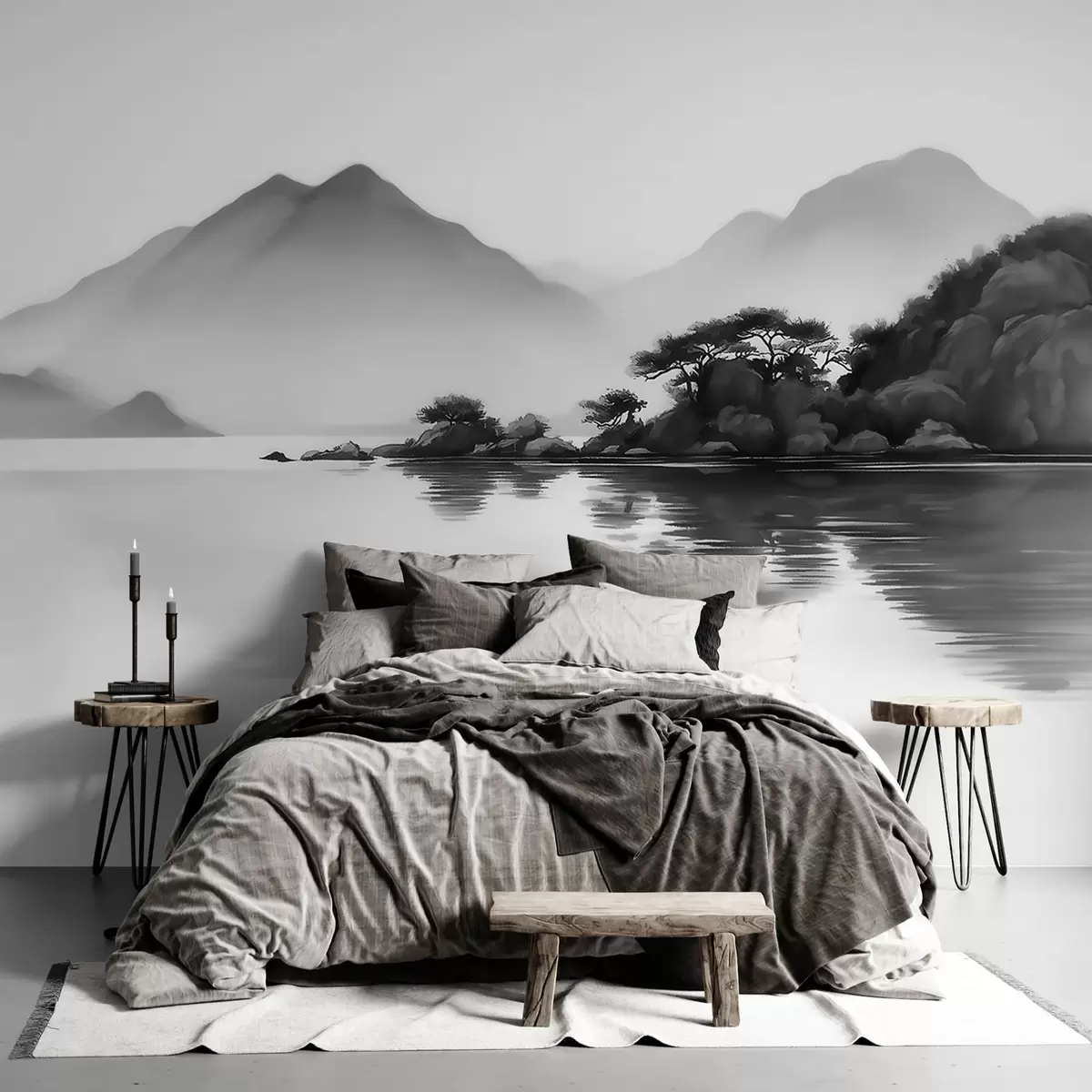 Fotomurales Paisaje en blanco y negro con montañas y un lago envueltos en una suave niebla Nr. w09803