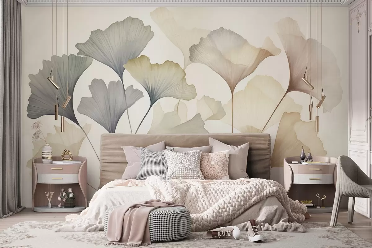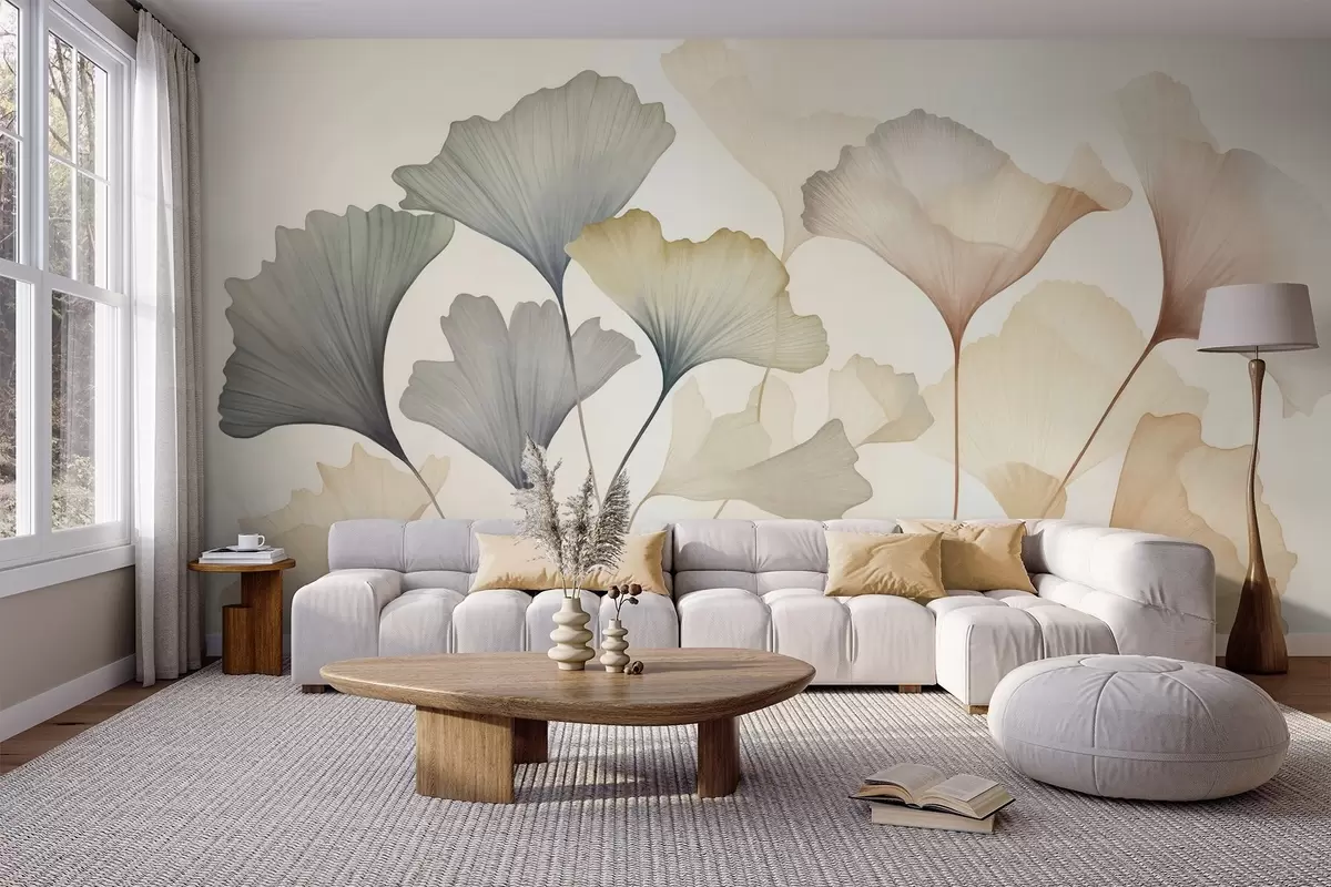 Fotomurales Hoja de ginkgo abstracta en tonos pastel apagados, como el azul, el verde y el melocotón; obra de arte con textura Nr. w09810