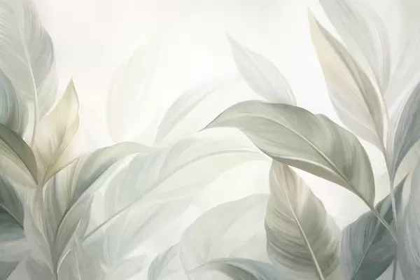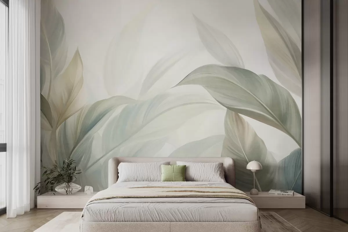 Fotomurales Hojas tropicales grandes de color verde pálido con tonos suaves y pasteles, obra de arte con textura Nr. w09816