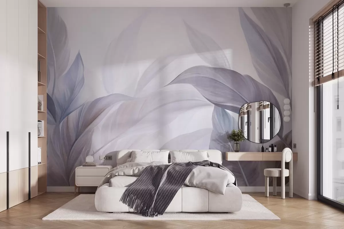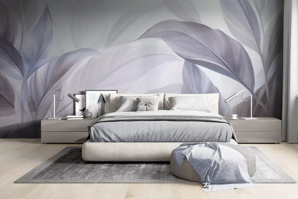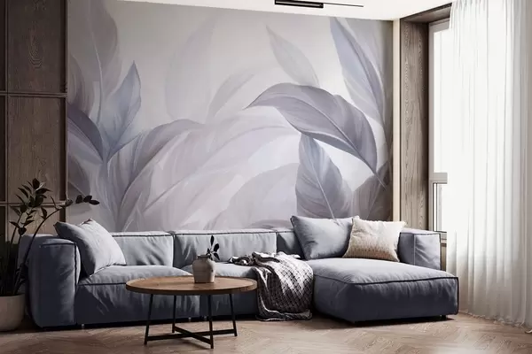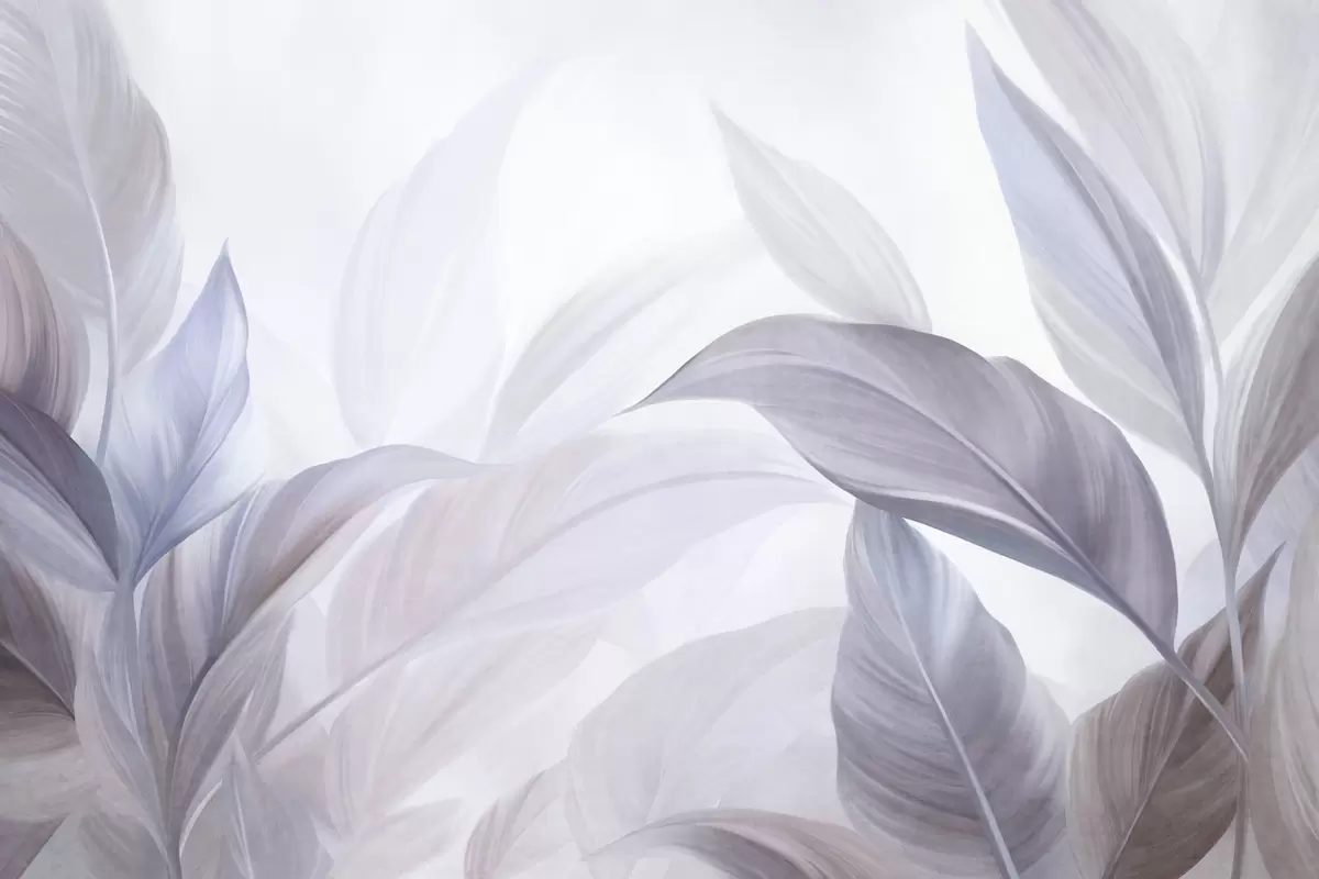 Fotomurales Hojas tropicales grandes, de color azul pálido y violeta, con tonos suaves y pasteles, y una textura artística Nr. w09816v1