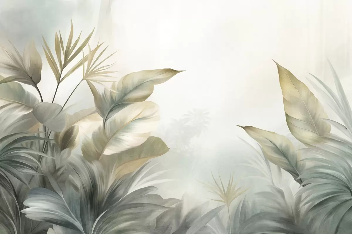 Fotomurales Hojas tropicales grandes y con textura en tonos apagados de verde y beige, un ambiente selvático Nr. w09820