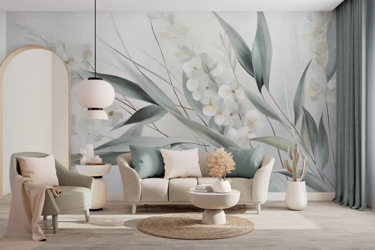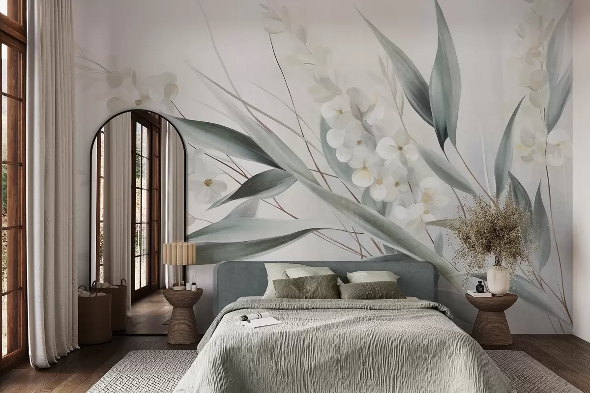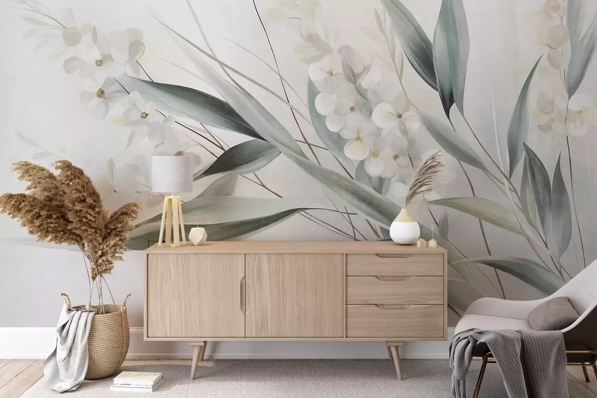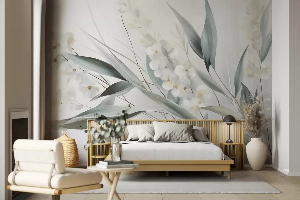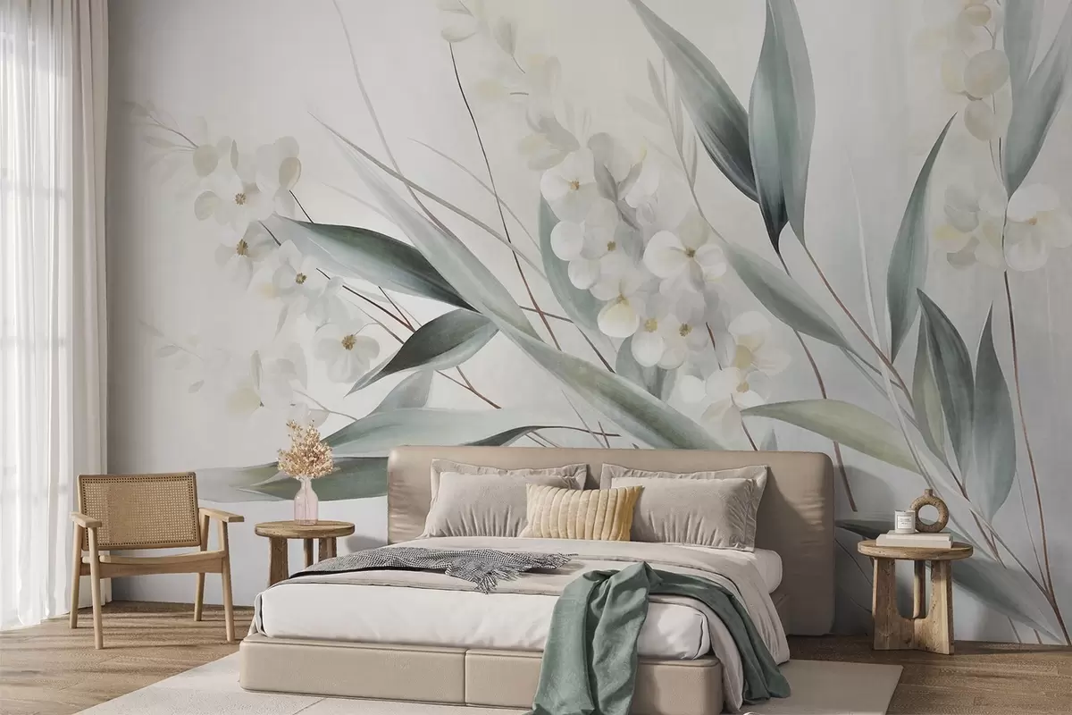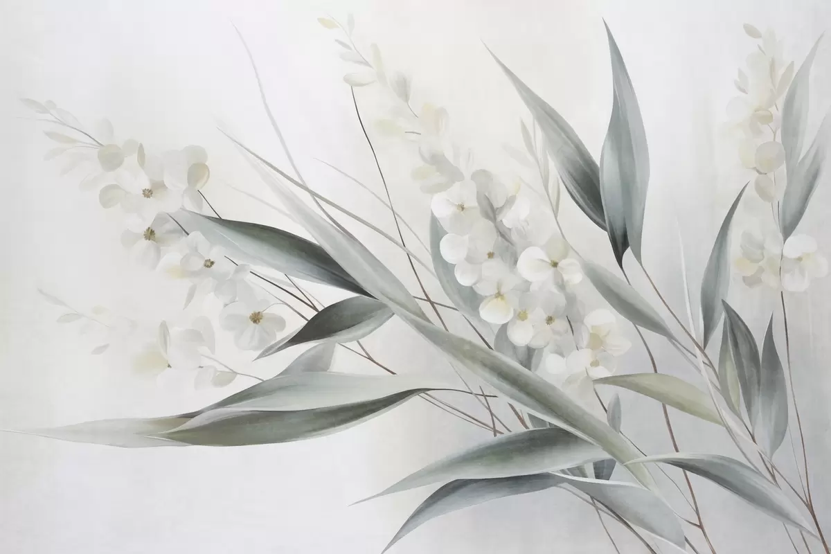 Fotomurales Flores delicadas y largas hojas verdes en un estilo pictórico con sutiles pinceladas, obra de arte con textura Nr. w09827