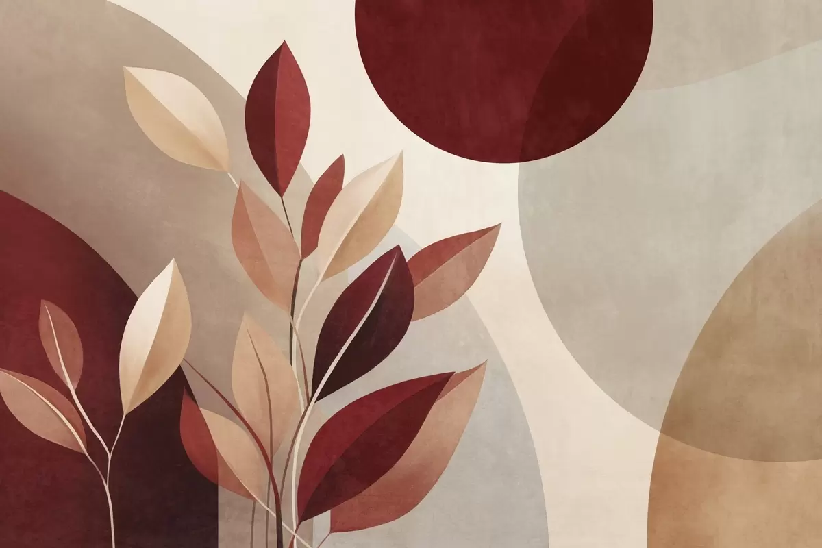 Fotomurales Hojas con textura en tonos burdeos y beige sobre un fondo de formas abstractas, minimalismo y arte moderno Nr. w09829