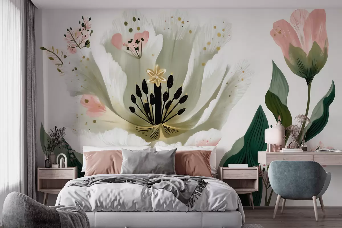 Fotomurales Una flor con hojas verdes y toques de color rosa pálido en estilo acuarela Nr. w09836
