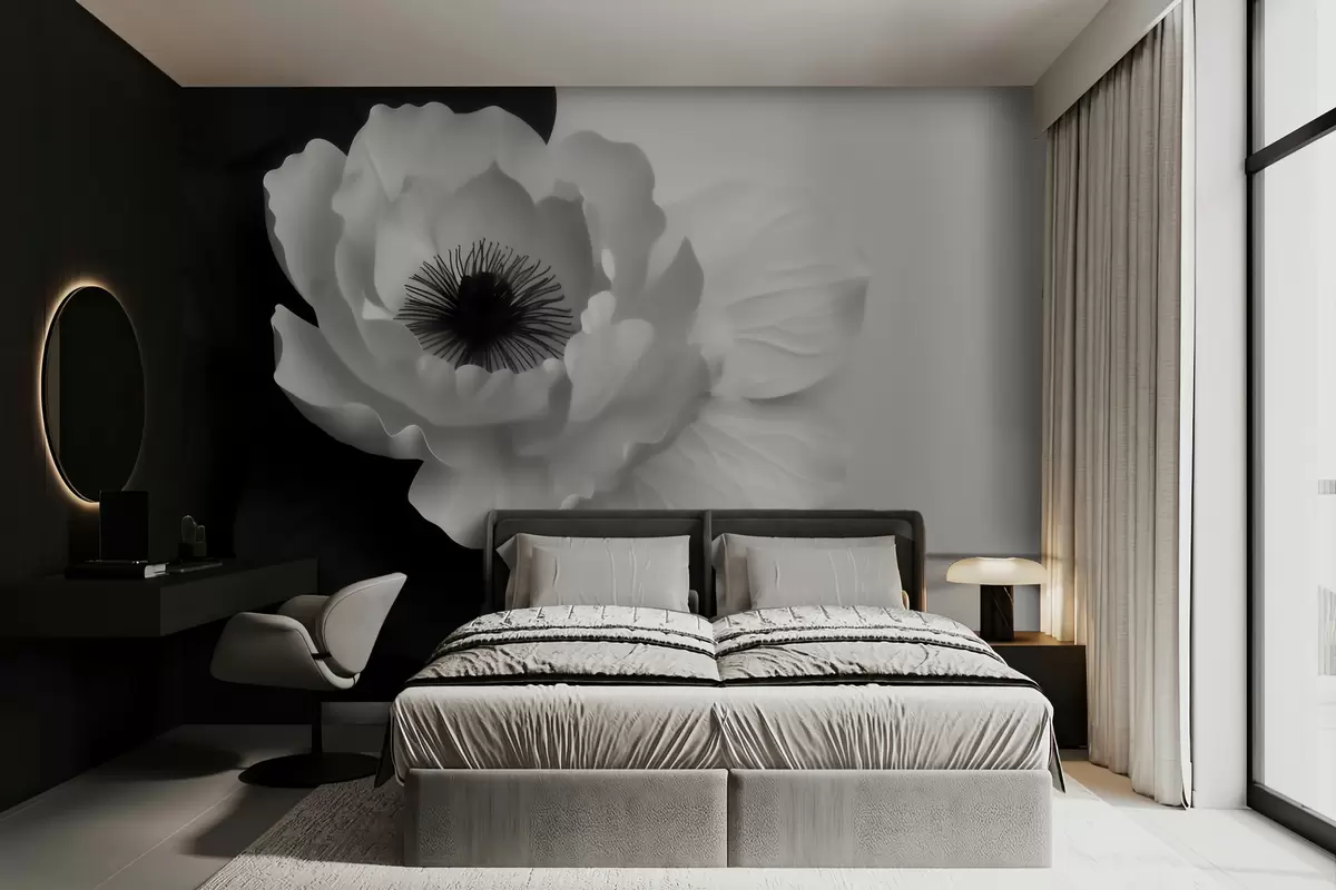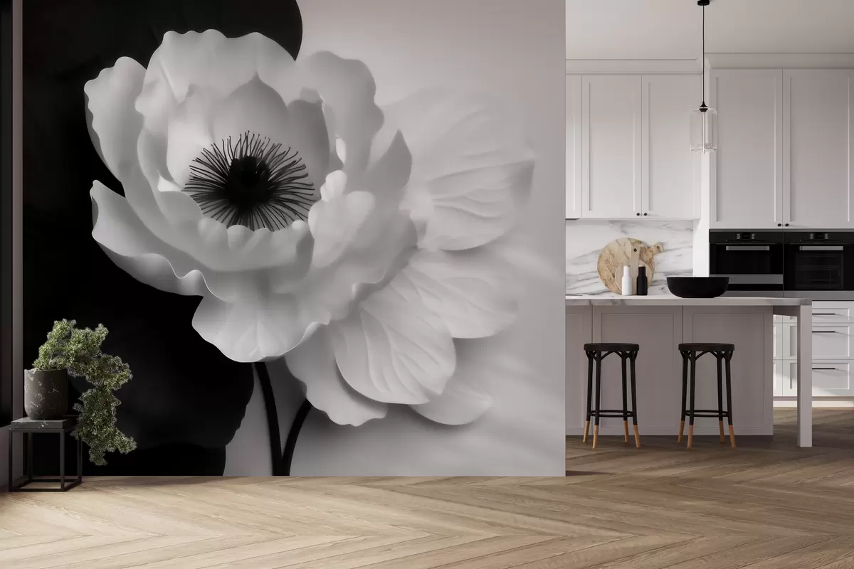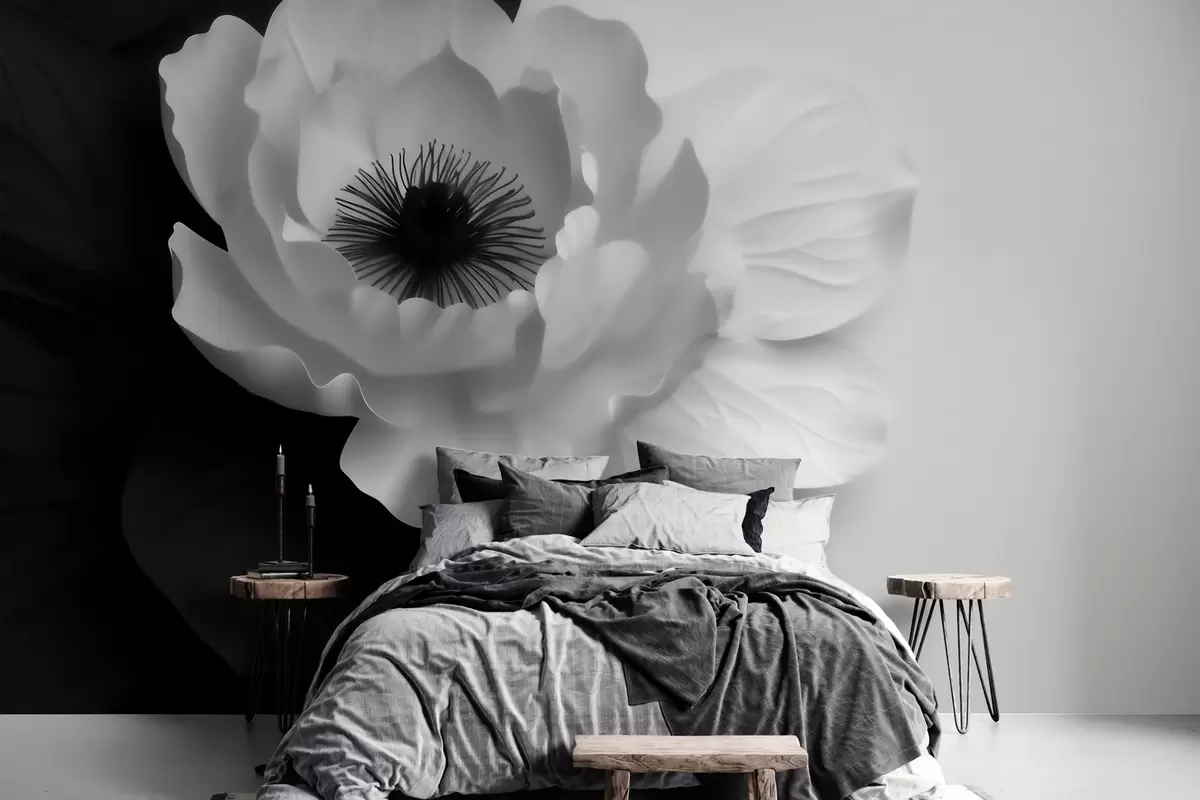 Fotomurales Una flor blanca que contrasta con un centro oscuro sobre un fondo en blanco y negro Nr. w09852
