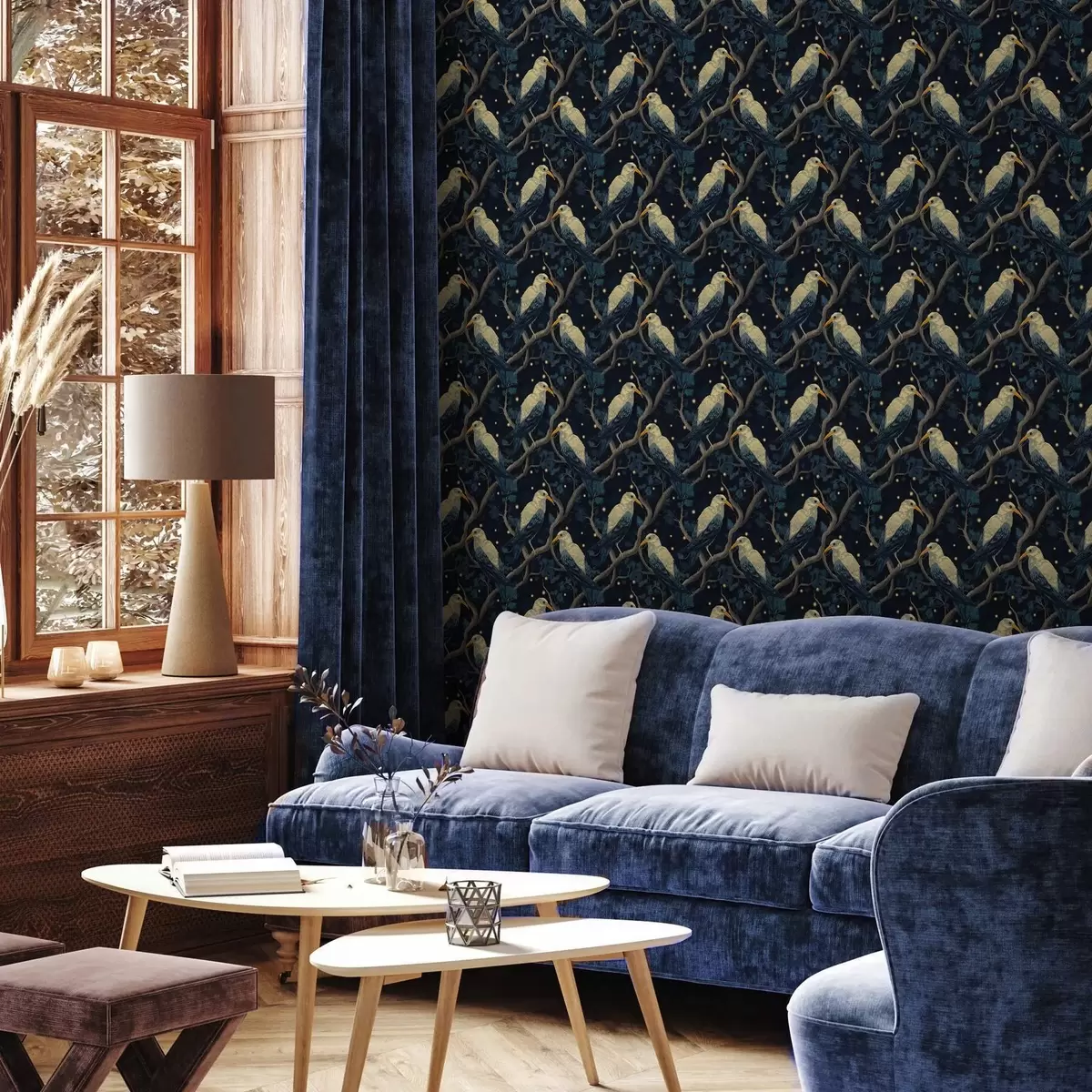 Papel tapiz Pájaros nocturnos sobre ramas y estrellas sobre fondo azul oscuro Nr. a00109v1