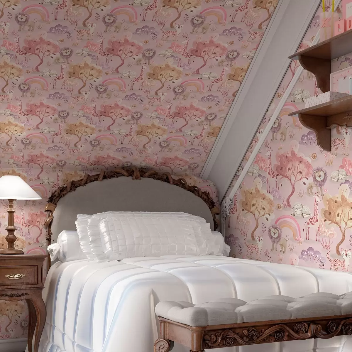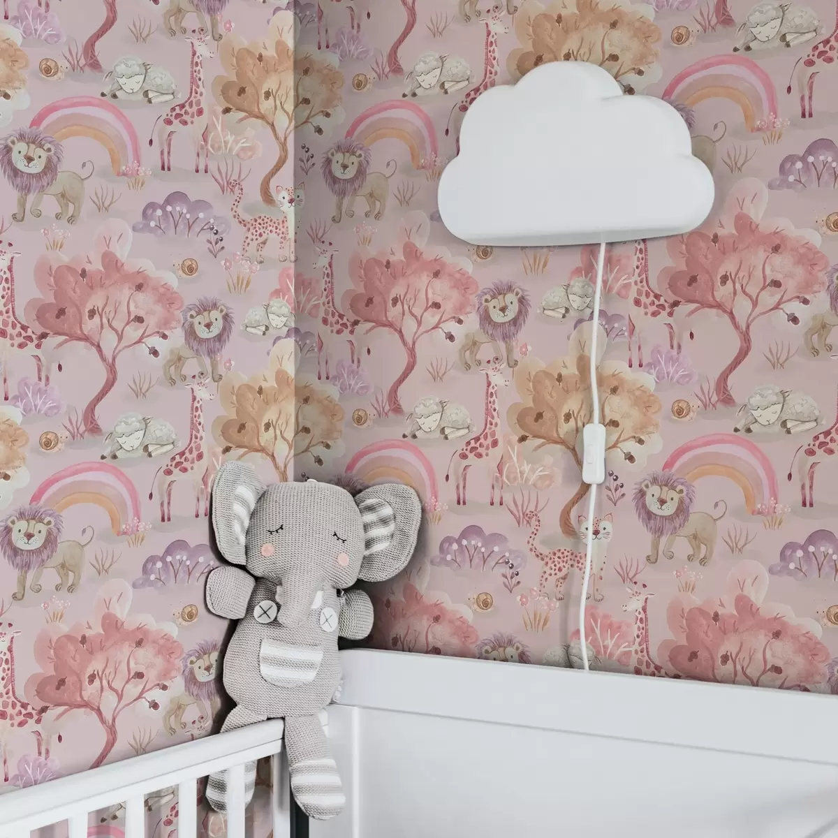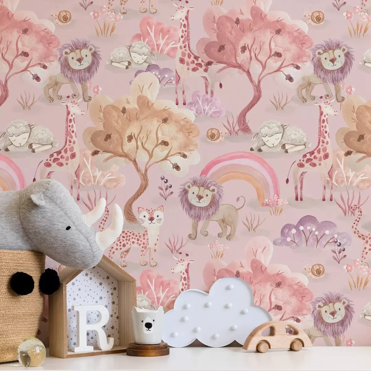 Papel tapiz Cachorros de león, jirafas y arco iris en un bosque de colores pastel Nr. a00112