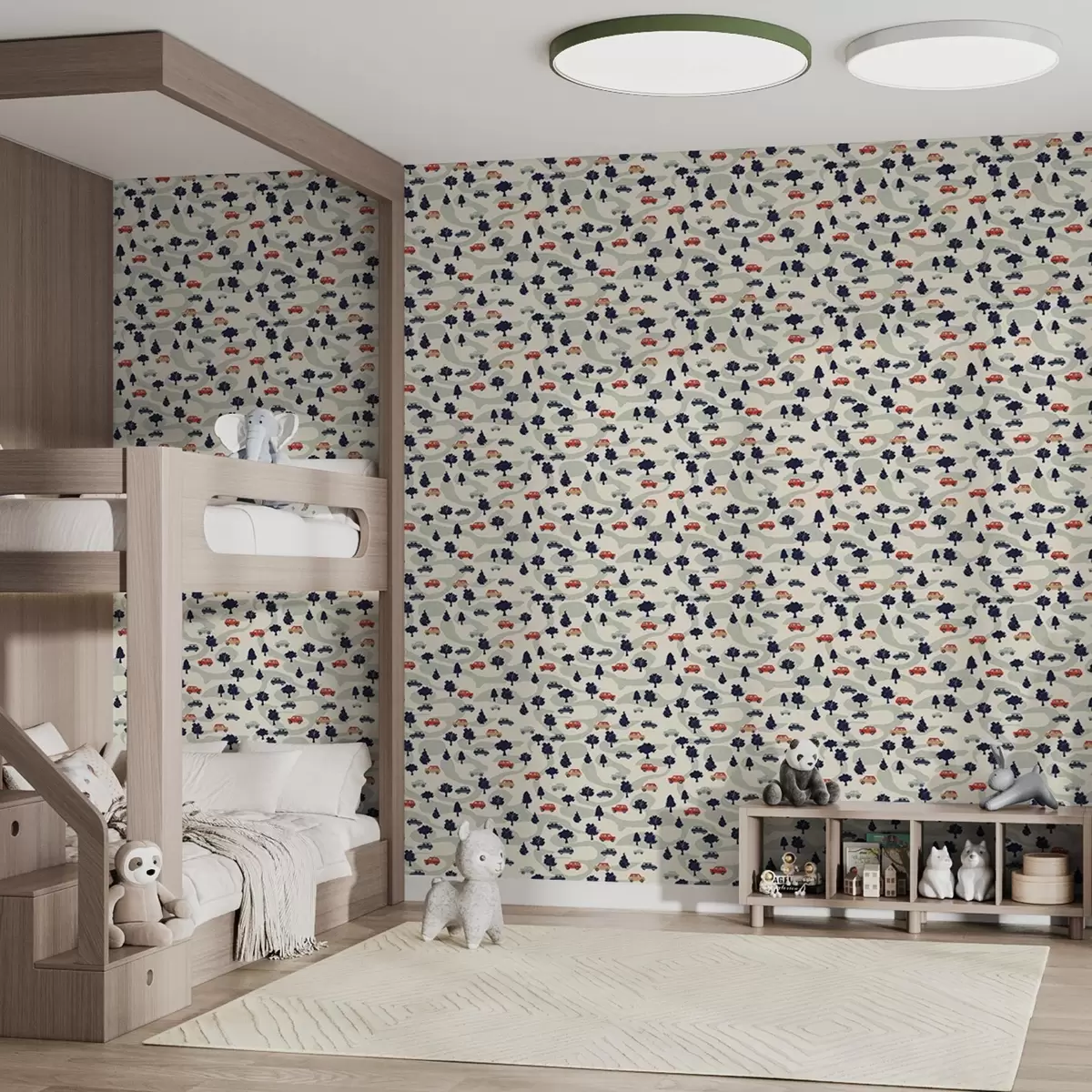 Papel tapiz Divertidos coches entre los árboles sobre fondo crema Nr. a00119