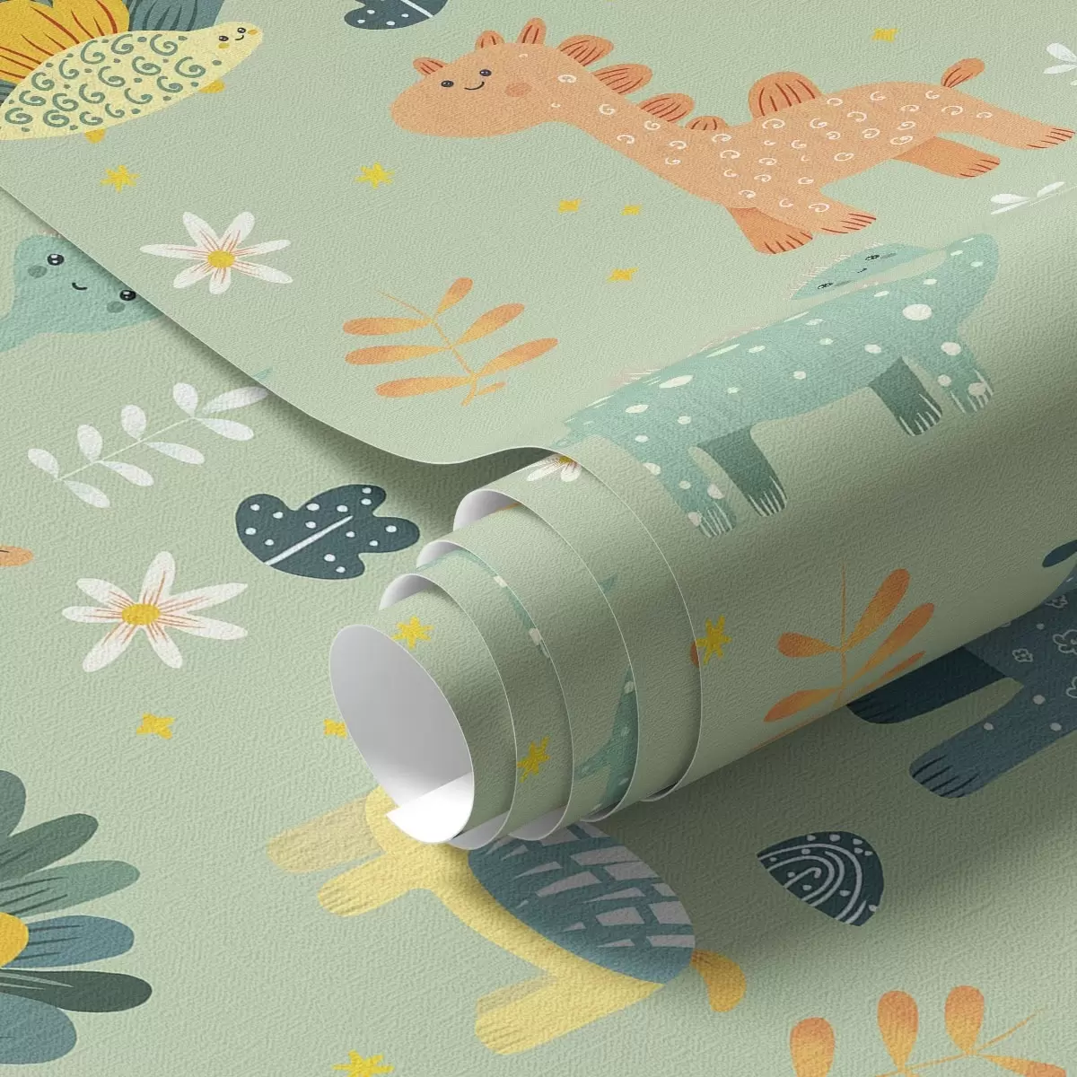 Papel tapiz Divertidos dinosaurios en una suave paleta verde sobre fondo claro Nr. a00125v1