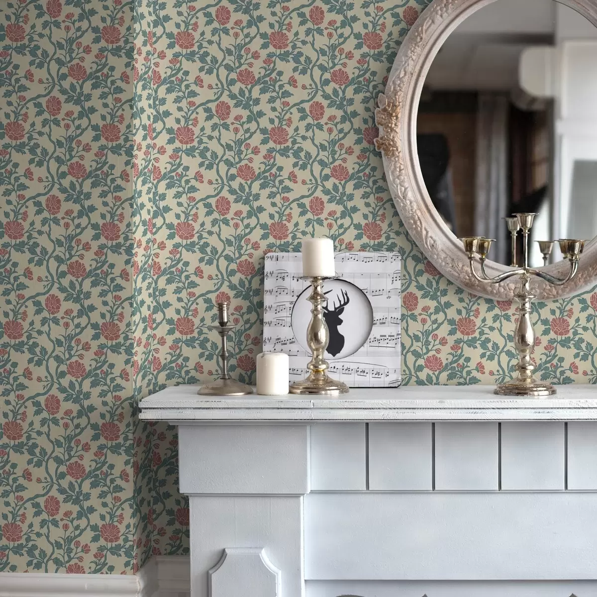 Papel tapiz Motivo retro con flores en rojo y verde Nr. a00250