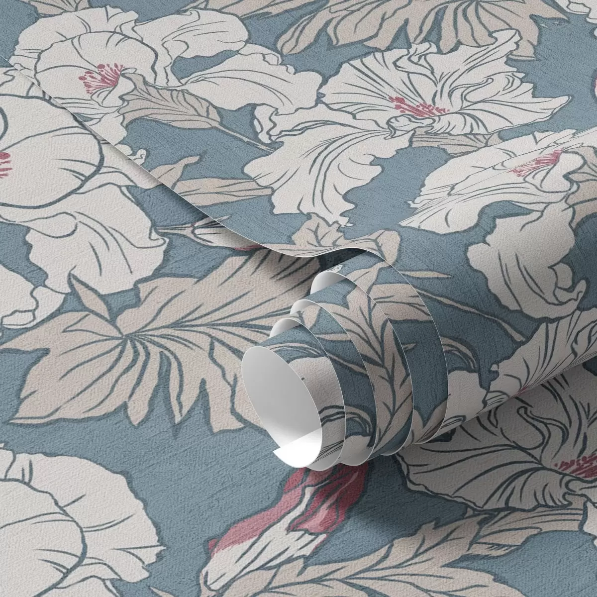 Papel tapiz Hibisco blanco sobre fondo azul con dibujo de contorno Nr. a00272v1