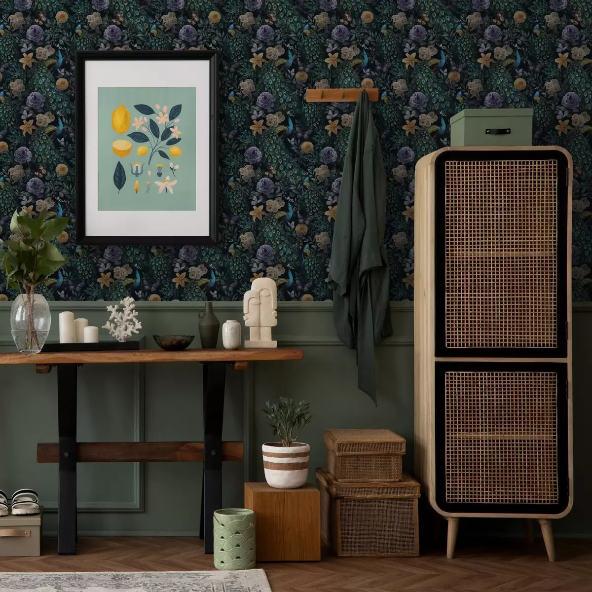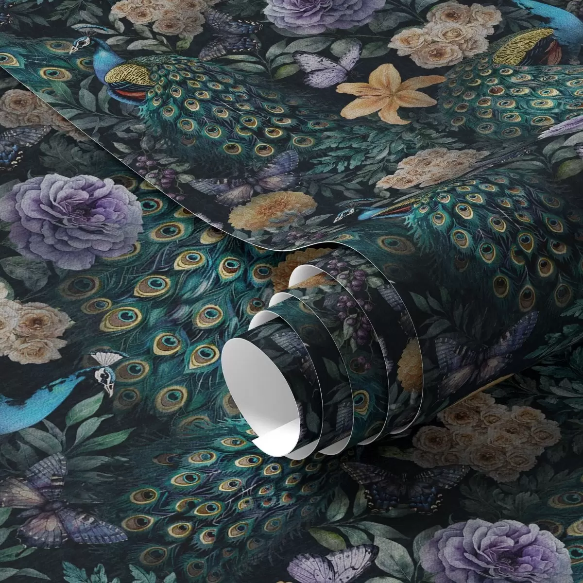 Papel tapiz Pavos reales entre flores oscuras y mariposas Nr. a00348