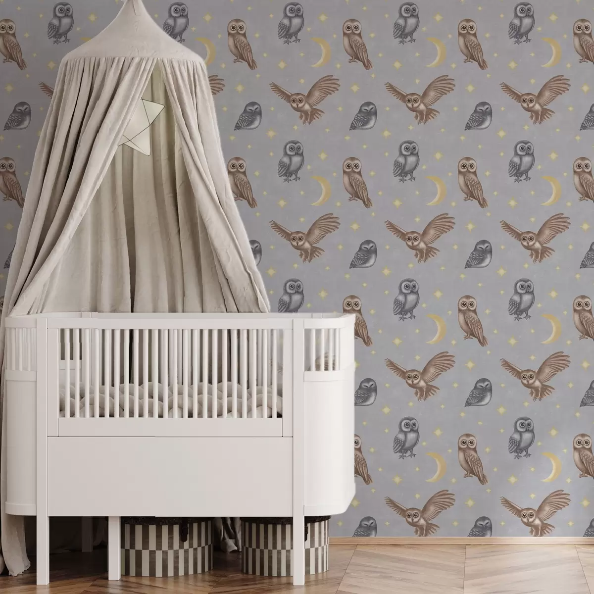 Papel tapiz Búhos y estrellas sobre un fondo de cielo nocturno gris Nr. a00475