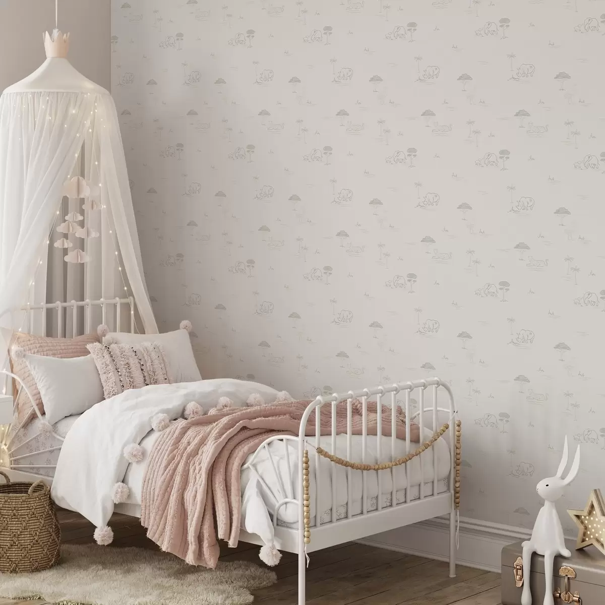 Papel tapiz Safari minimalista: elefantes, rinocerontes, leopardos y palmeras Nr. a00492