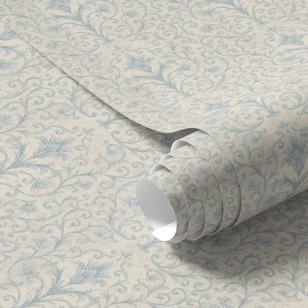 Papel tapiz Damasco azul con volutas sobre fondo crema Nr. a00578