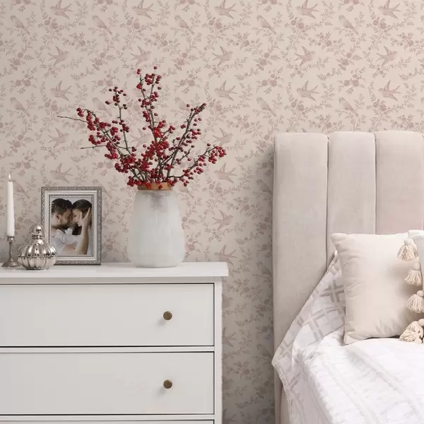 Papel tapiz Pájaros y rosas, estampado vintage en rosa empolvado Nr. a00587