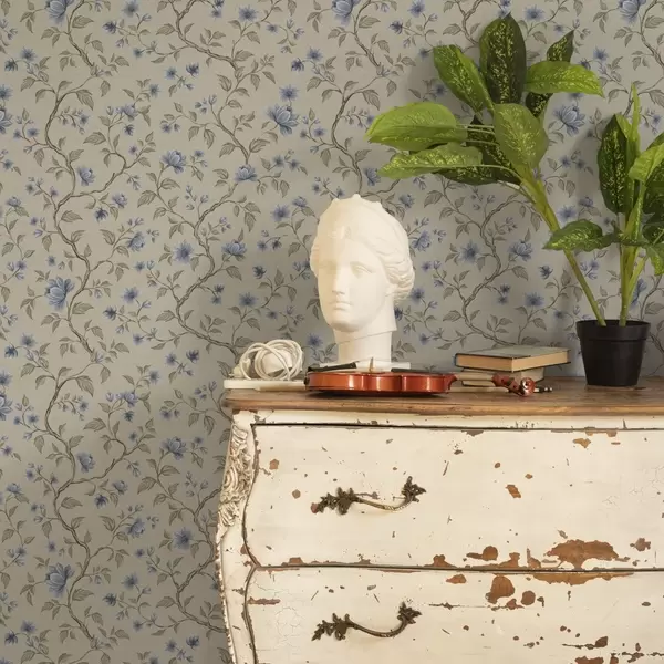 Papel tapiz Ramas con flores azules sobre fondo beige lino Nr. a00590