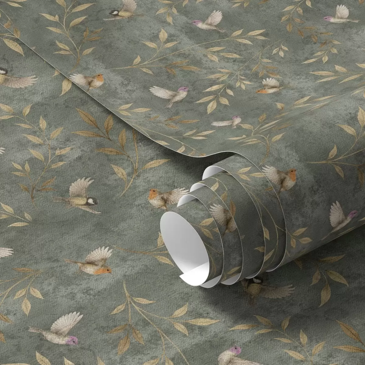 Papel tapiz Pájaros entre follaje naranja sobre un fondo verde intenso Nr. a00591
