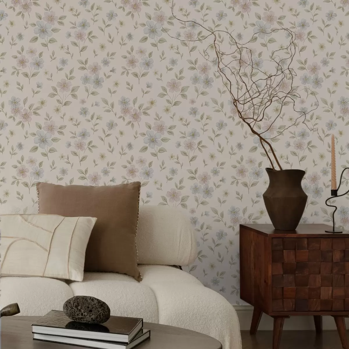 Papel tapiz Flores de campo en tonos pastel sobre fondo crema Nr. a00596