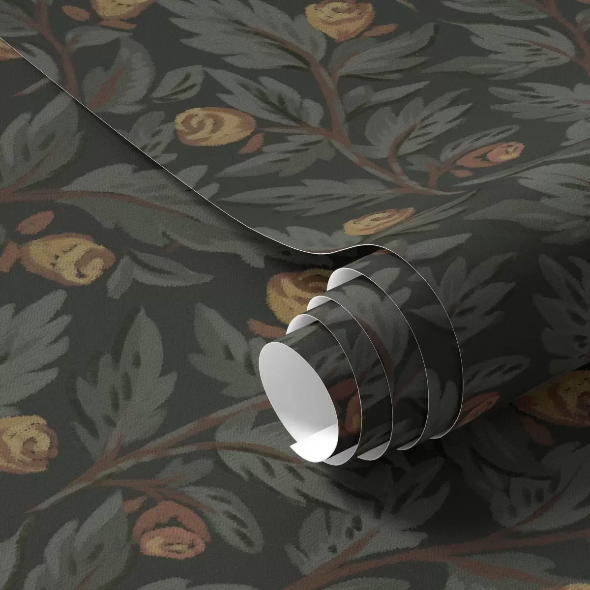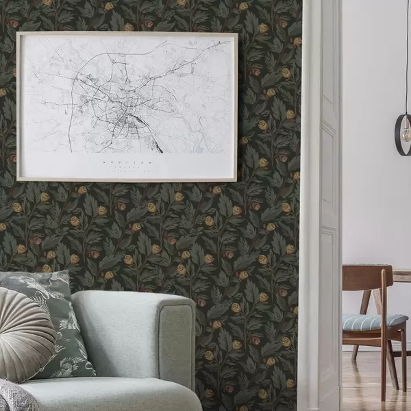 Papel tapiz Estampado floral oscuro con capullos y hojas amarillos Nr. a00598