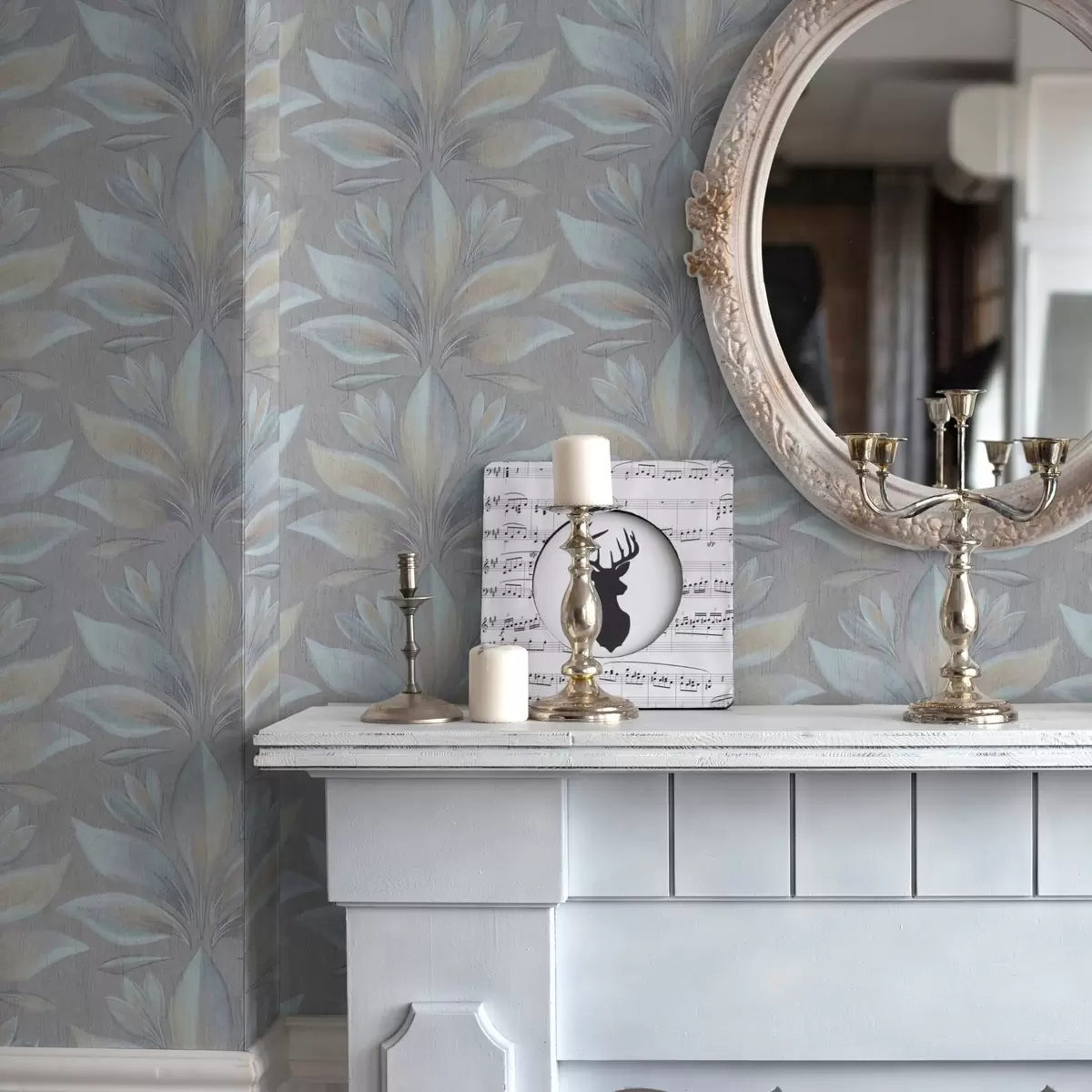 Papel tapiz Grandes hojas estilizadas en una paleta de colores azul arena sobre fondo gris Nr. a00601
