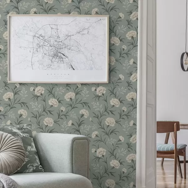 Papel tapiz Claveles en polvo sobre fondo gris verdoso, estampado refinado Nr. a00610