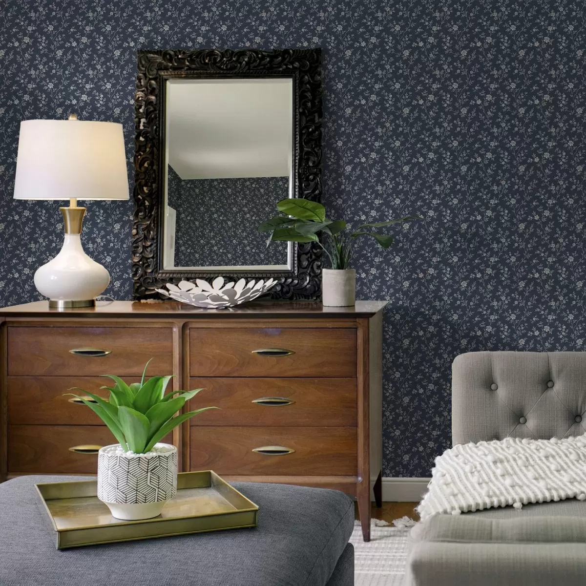 Papel tapiz Fondo azul marino oscuro con finas ramas y flores de color beige Nr. a00612