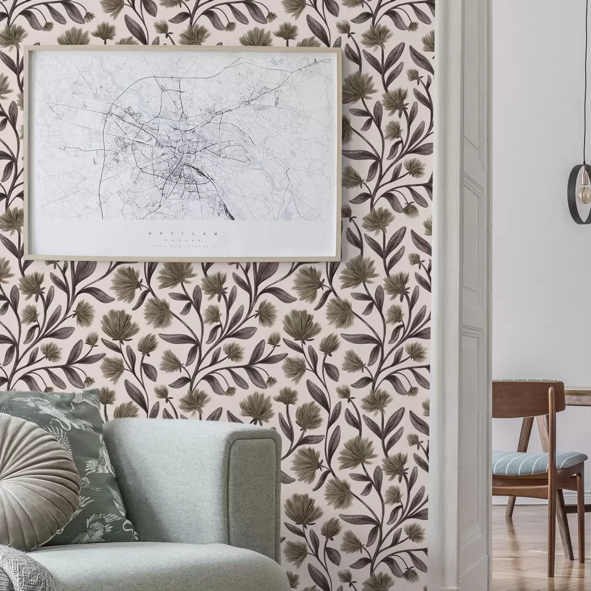 Papel tapiz Flores silvestres en tonos gris oliva sobre fondo crema Nr. a00623v1